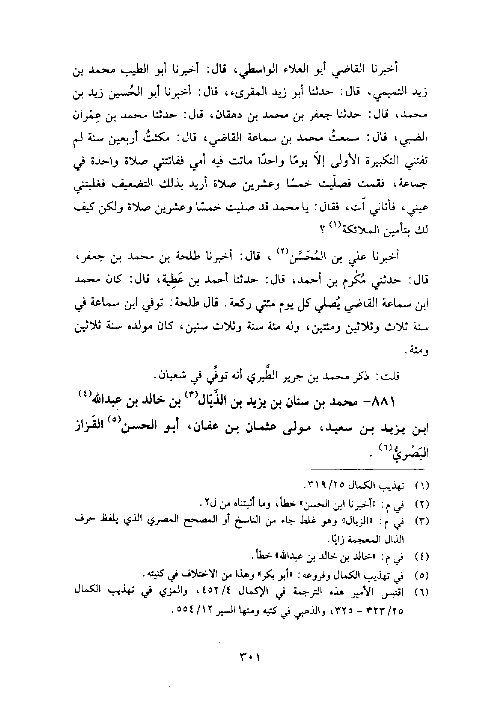 881 - محمد بن سنان بن يزيد بن الذيال بن خالد بن عبد الله بن يزيد بن سعيد مولى عثمان بن عفان أبو الحسن القزاز البصري وهو أخو يزيد بن سنان الذي كان بمصر، سكن محمد بغداد، وحدث بها عن: محمد بن بكر البرساني، وعمر بن يونس اليمامي، وأبي عاصم النبيل، ووهب بن جرير، وروح بن عبادة، وقريش بن أنس، وأبي عامر العقدي، ويحيى بن أبي بكير، وعمر بن محمد بن أبي رزين.