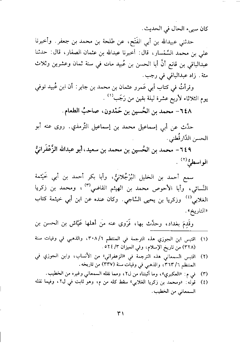 649 - محمد بن الحسين بن محمد بن سعيد أبو عبد الله الزعفراني الواسطي سمع: أحمد بن الخليل البرجلاني، وأبا بكر أحمد بن خيثمة النسائي، وأبا الأحوص محمد بن الهيثم القاضي، ومحمد بن زكريا الغلابي، وزكريا بن يحيى الساجي، وكان عنده عن أبي خيثمة كتاب التاريخ.