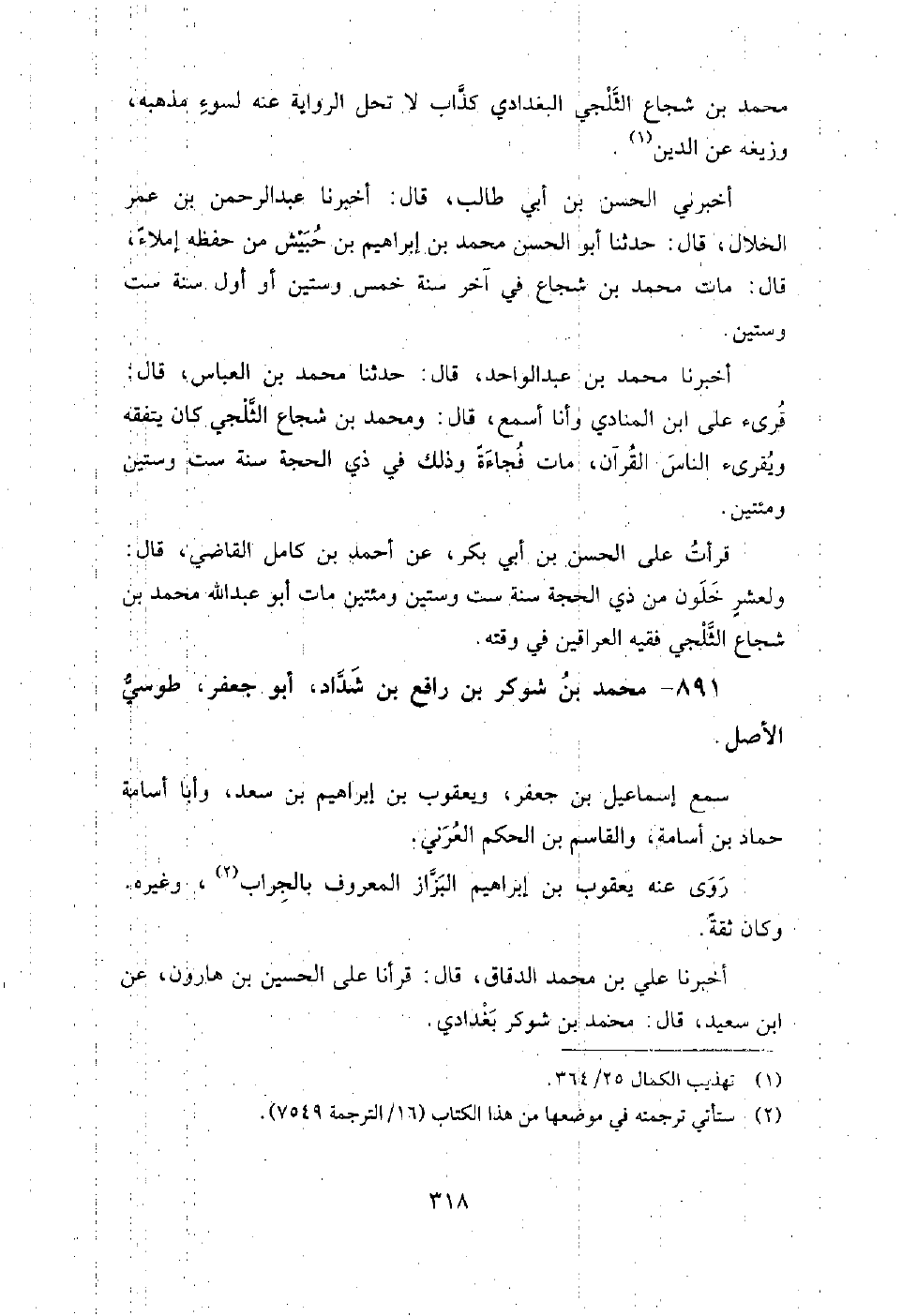 891 - محمد بن شوكر بن رافع بن شداد أبو جعفر طوسي الأصل سمع: إسماعيل بن جعفر، ويعقوب بن إبراهيم بن سعد، وأبا أسامة حماد بن أسامة، والقاسم بن الحكم العرني.
