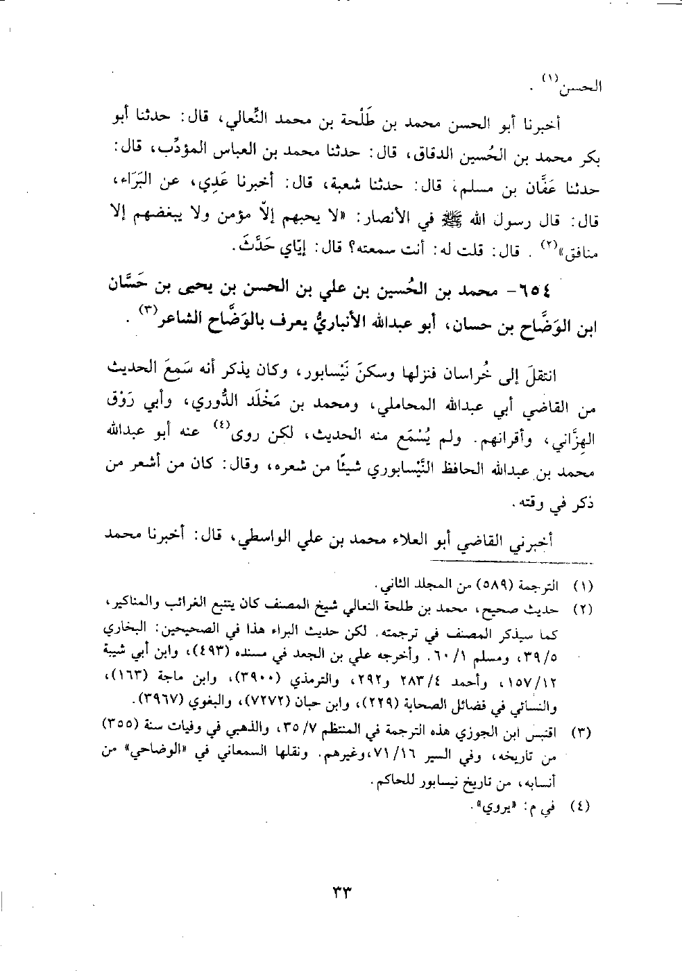 654 - محمد بن الحسين بن علي بن الحسن بن يحيى بن حسان بن الوضاح بن حسان أبو عبد الله الأنباري يعرف بالوضاح الشاعر انتقل إلى خراسان فنزلها وسكن نيسابور، وكان يذكر أنه سمع الحديث من: القاضي أبي عبد الله المحاملي، ومحمد بن مخلد الدوري، وأبي روق الهزاني، وأقرانهم، ولم يسمع منه الحديث، لكن روى عنه: أبو عبد الله محمد بن عبد الله الحافظ النيسابوري شيئا من شعره، وَقَالَ: كان من أشعر من ذكر في وقته.