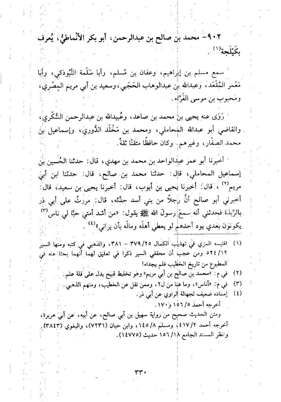 902 - محمد بن صالح بن عبد الرحمن أبو بكر الأنماطي يعرف بكيلجة سمع: مسلم بن إبراهيم، وعفان بن مسلم، وأبا سلمة التبوذكي، وأبا معمر المقعد، وعبد الله بن عبد الوهاب الحجبي، وسعيد بن أبي مريم المصري، ومحبوب بن موسى الفراء.