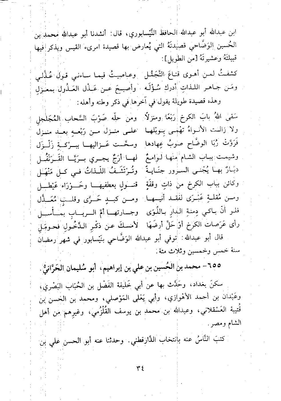 655 - محمد بن الحسين بن علي بن إبراهيم أبو سليمان الحراني سكن بغداد، وحدث بها عن: أبي خليفة الفضل بن الحباب البصري، وعبدان بن أحمد الأهوازي، وأبي يعلى الموصلي، ومحمد بن الحسن بن قتيبة العسقلاني، وعبد الله بن محمد بن يوسف القلزمي، وغيرهم من أهل الشام ومصر.
