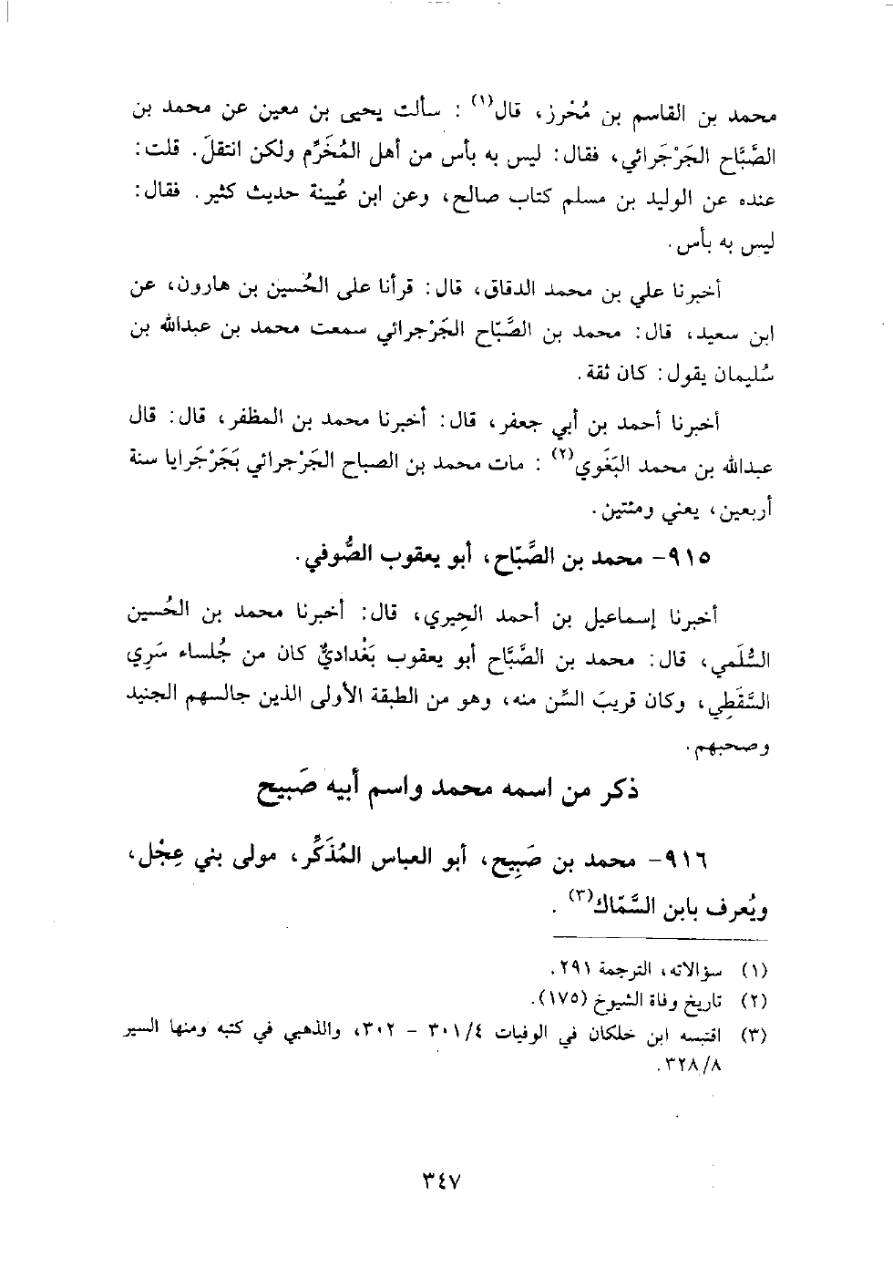 916 - محمد بن صبيح أبو العباس المذكر مولى بني عجل ويعرف بابن السماك سمع: هشام بن عروة، وإسماعيل بن أبي خالد، وسليمان الأعمش، وعائذ بن نسير، ويزيد بن أبي زياد، والسري بن يحيى، والعوام بن حوشب، وسفيان الثوري.