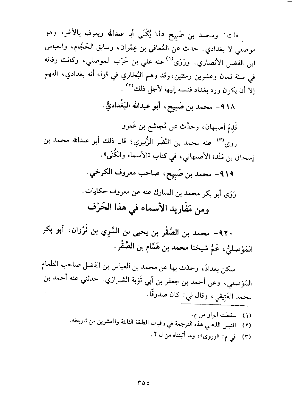 918 - محمد بن صبيح أبو عبد الله البغدادي قدم أصبهان، وحدث عن: مجاشع بن عمرو، روى عنه: محمد بن النصر الزبيري، قَالَ ذلك: أبو عبد الله محمد بن إسحاق بن منده الأصبهاني في كتاب الأسماء والكنى