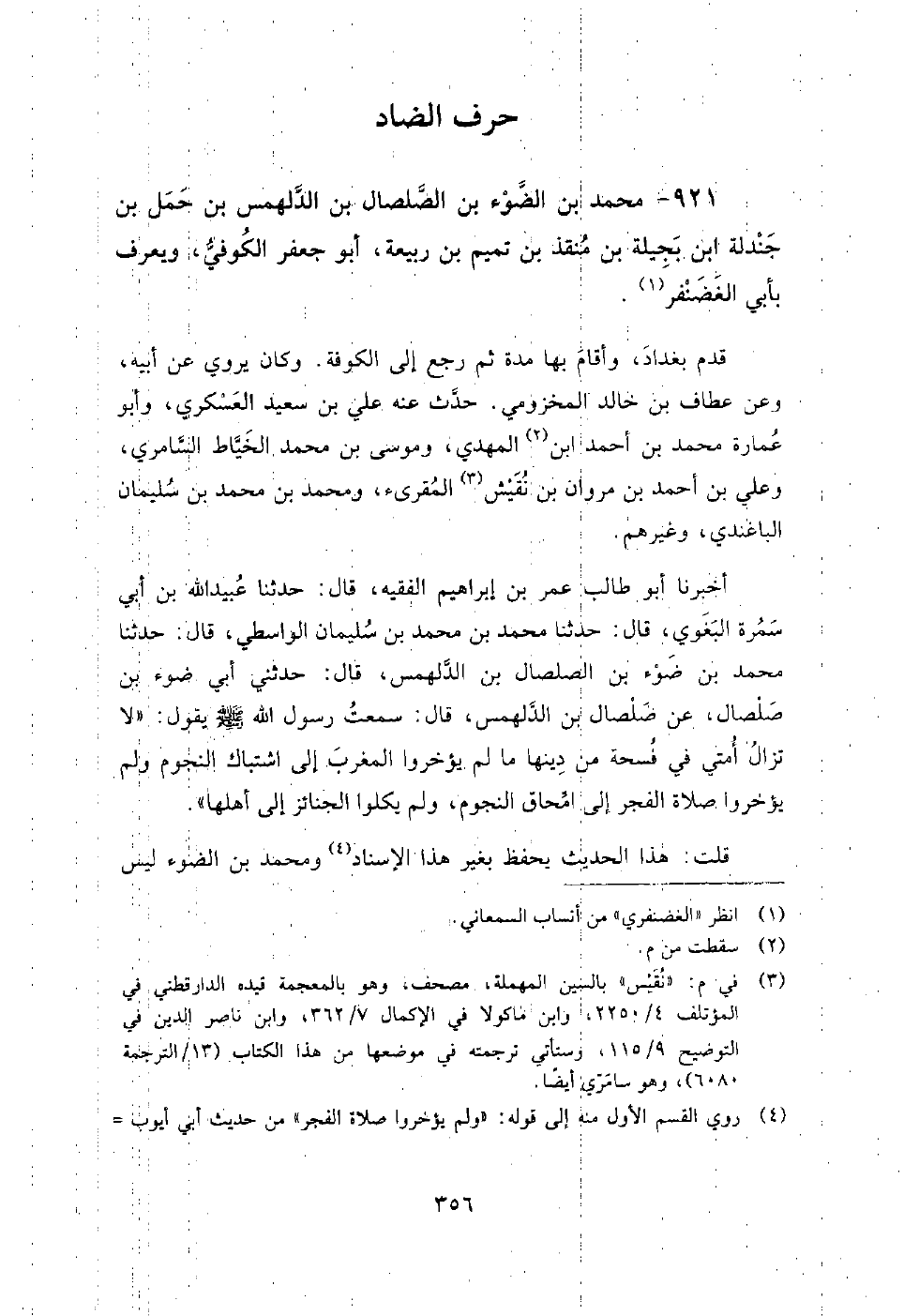 921 - محمد بن الضوء بن الصلصال بن الدلهمس بن حمل بن جندلة ابن بجيلة بن منقذ بن تميم بن ربيعة أبو جعفر الكوفي ويعرف بأبي الغضنفر قدم بغداد، وأقام بها مدة ثم رجع إلى الكوفة.