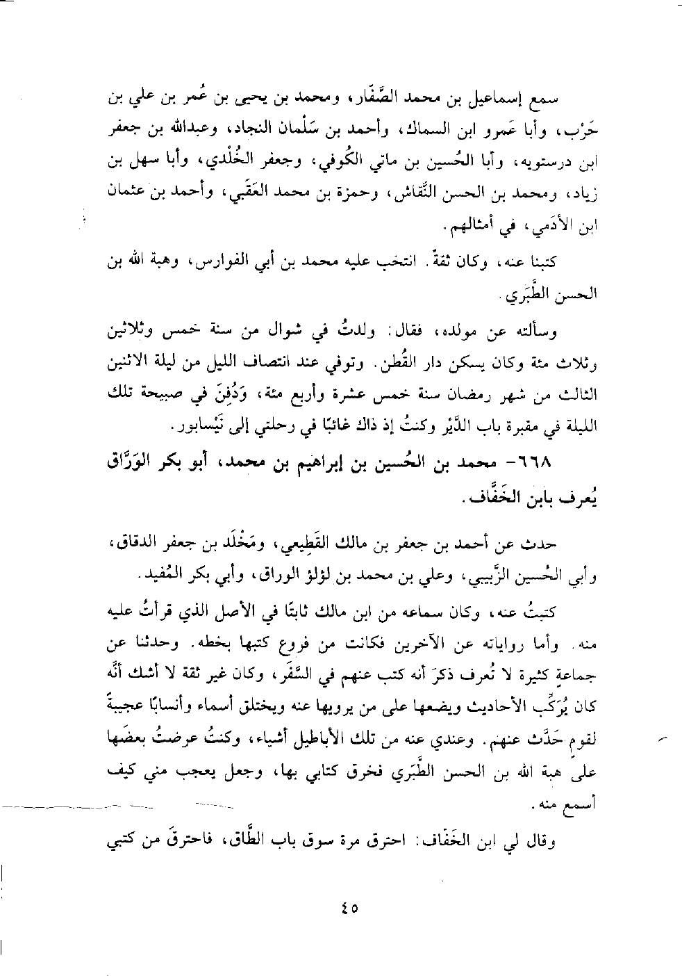 668 - محمد بن الحسين بن إبراهيم بن محمد أبو بكر الوراق يعرف بابن الخفاف حدث عن أحمد بن جعفر بن مالك القطيعي، ومخلد بن جعفر الدقاق، وأبي الحسين الزينبي، وعلي بن محمد بن لؤلؤ الوراق، وأبي بكر المفيد.