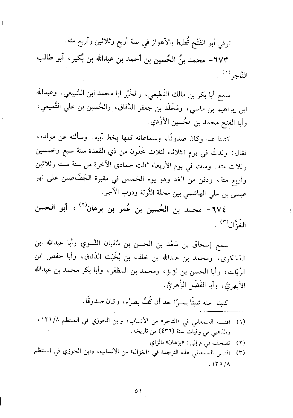 674 - محمد بن الحسين بن عمر بن برهان أبو الحسن الغزال سمع: إسحاق بن سعد بن الحسن بن سفيان النسوي، وأبا عبد الله ابن العكسري، ومحمد بن عبد الله بن خلف بن بخيت الدقاق، وأبا حفص ابن الزيات، وأبا الحسن بن لؤلؤ، ومحمد بن المظفر، وأبا بكر محمد بن عبد الله الأبهري، وأبا الفضل الزهري.