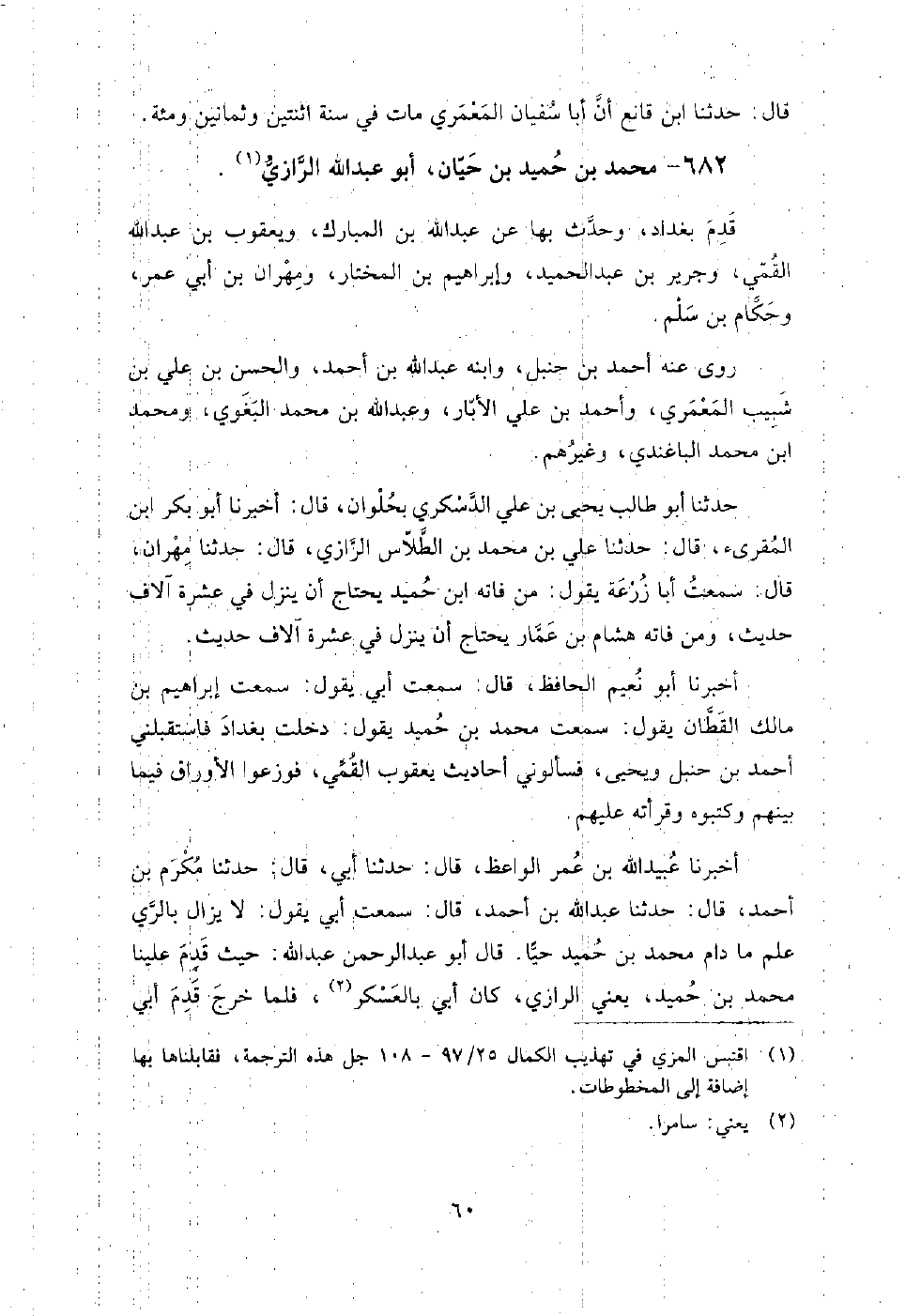 682 - محمد بن حميد بن حيان أبو عبد الله الرازي قدم بغداد، وحدث بها عن: عبد الله بن المبارك، ويعقوب بن عبد الله القمي، وجرير بن عبد الحميد، وإبراهيم بن المختار، ومهران بن أبي عمر، وحكام بن سلم.