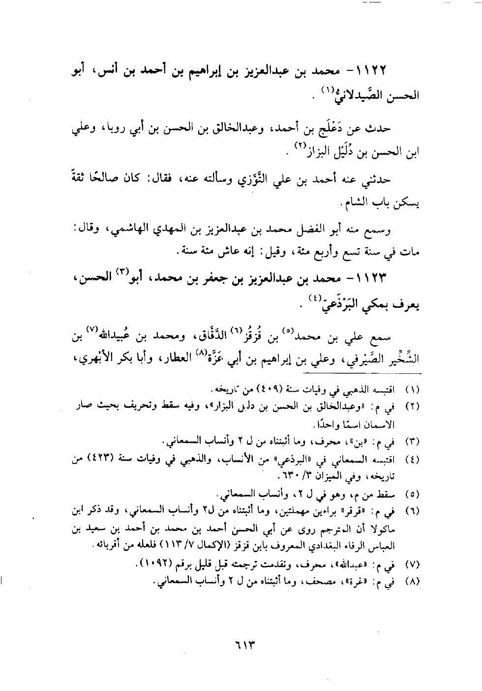 1123 - محمد بن عبد العزيز بن جعفر بن محمد أبو الحسن يعرف بمكي البرذعي سمع: علي بن محمد بن قزقز الدقاق، ومحمد بن عبيد الله بن الشخير الصيرفي، وعلي بن إبراهيم بن أبي عزة العطار، وأبا بكر الأبهري، وأبا بكر بن شاذان، وأبا المفضل الشيباني، وأحمد بن محمد الجندي.