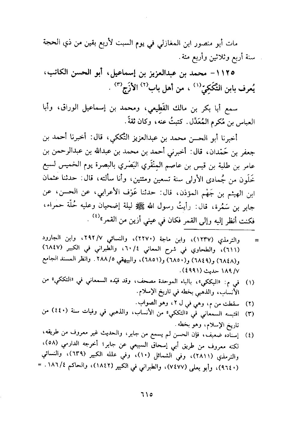 1125 - محمد بن عبد العزيز بن إسماعيل أبو الحسن الكاتب يعرف بابن التككي من أهل باب الأزج سمع: أبا بكر بن مالك القطيعي، ومحمد بن إسماعيل الوراق، وأبا العباس بن مكرم المعدل.