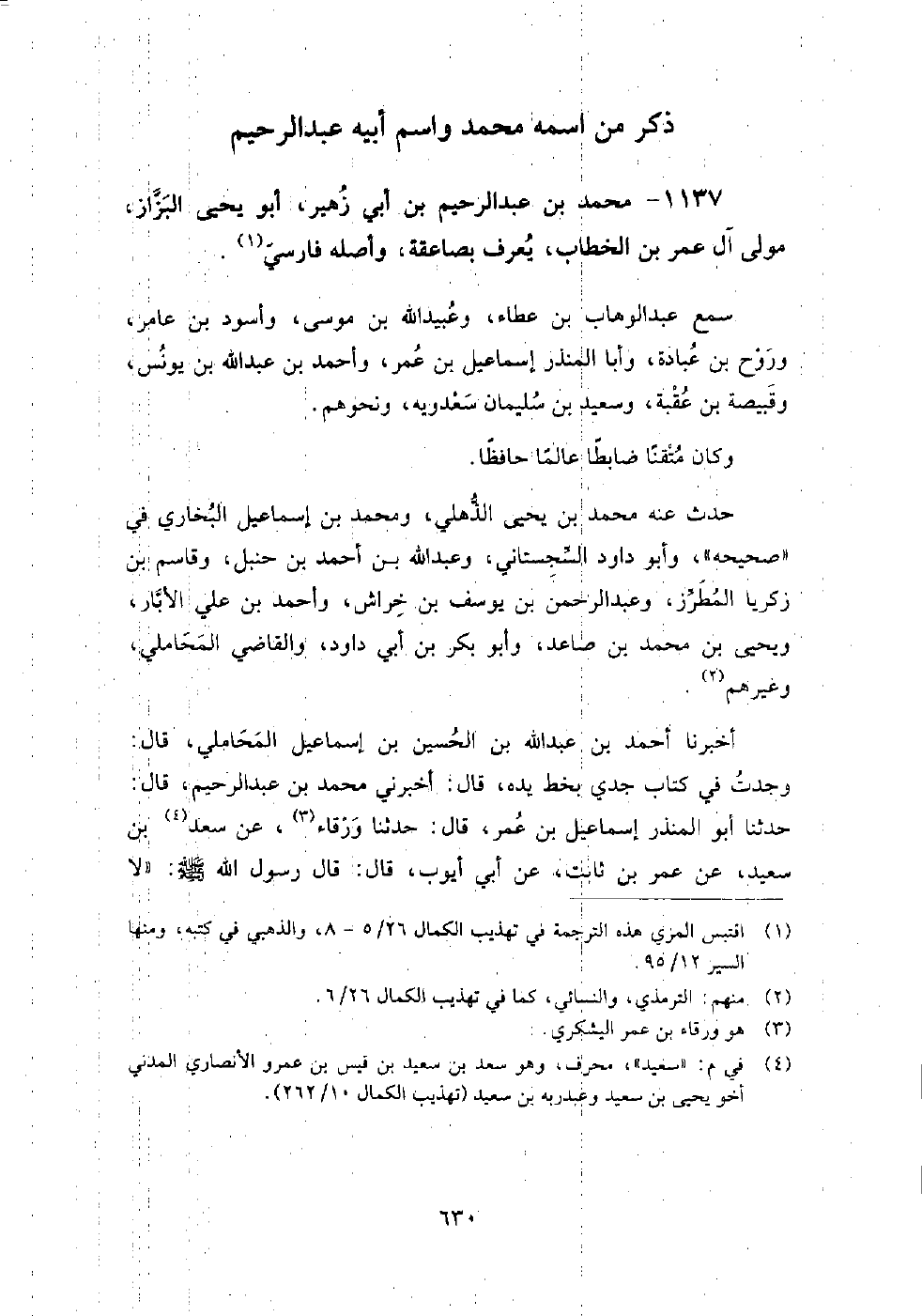 1137 - محمد بن عبد الرحيم بن أبي زهير أبو يحيى البزاز مولى آل عمر بن الخطاب يعرف بصاعقة وأصله فارسي سمع: عبد الوهاب بن عطاء، وعبيد الله بن موسى، وأسود بن عامر، وروح بن عبادة، وأبا المنذر إسماعيل بن عمر، وأحمد بن عبد الله بن يونس، وقبيصة بن عقبة، وسعيد بن سليمان سعدويه، ونحوهم.