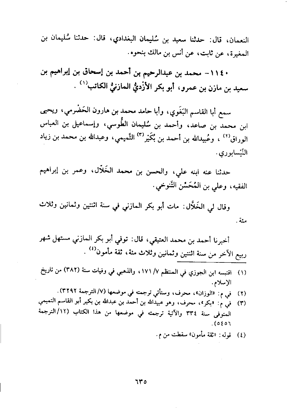 1140 - محمد بن عبد الرحيم بن أحمد بن إسحاق بن إبراهيم بن سعيد بن مازن بن عمرو أبو بكر الأزدي المازني الكاتب سمع: أبا القاسم البغوي، وأبا حامد محمد بن هارون الحضرمي، ويحيى بن محمد بن صاعد، وأحمد بن سليمان الطوسي، وإسماعيل بن العباس الوراق، وعبيد الله بن أحمد بن بكير التميمي، وعبد الله بن محمد بن زياد النيسابوري.