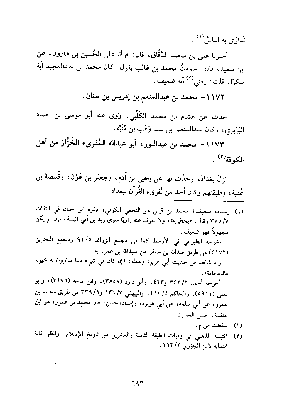 1173 - محمد بن عبد النور أبو عبد الله المقرئ الخزاز من أهل الكوفة، نزل بغداد، وحدث بها عن: يحيى بن آدم، وجعفر بن عون، وقبيصة بن عقبة، وطبقتهم، وكان أحد من يقرئ القرآن ببغداد.