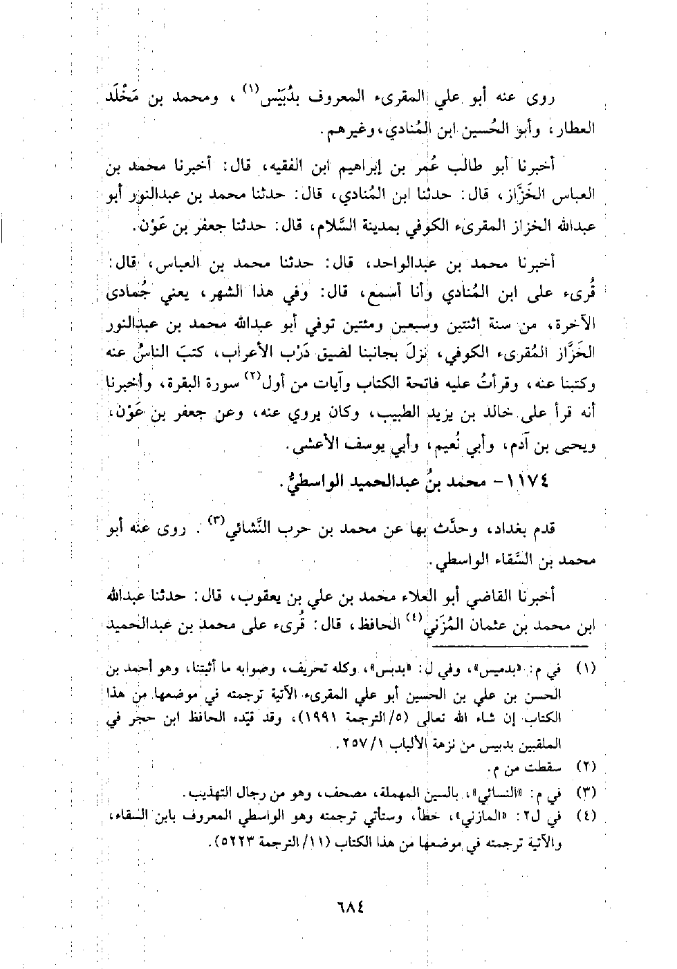 1174 - محمد بن عبد الحميد الواسطي قدم بغداد، وحدث بها عن: محمد بن حرب النشائي، روى عنه: أبو محمد بن السقاء الواسطي.
