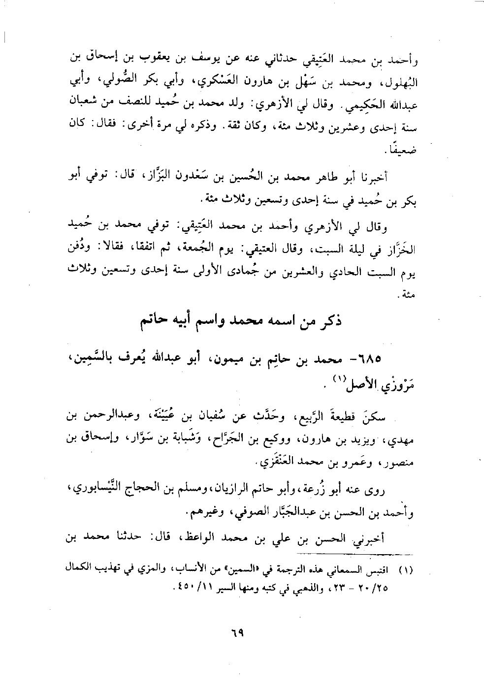 685 - محمد بن حاتم بن ميمون أبو عبد الله يعرف بالسمين مروزي الأصل سكن قطيعة الربيع، وحدث عن: سفيان بن عيينة، وعبد الرحمن بن مهدي، ويزيد بن هارون، ووكيع بن الجراح، وشبابة بن سوار، وإسحاق بن منصور، وعمرو بن محمد العنقزي.