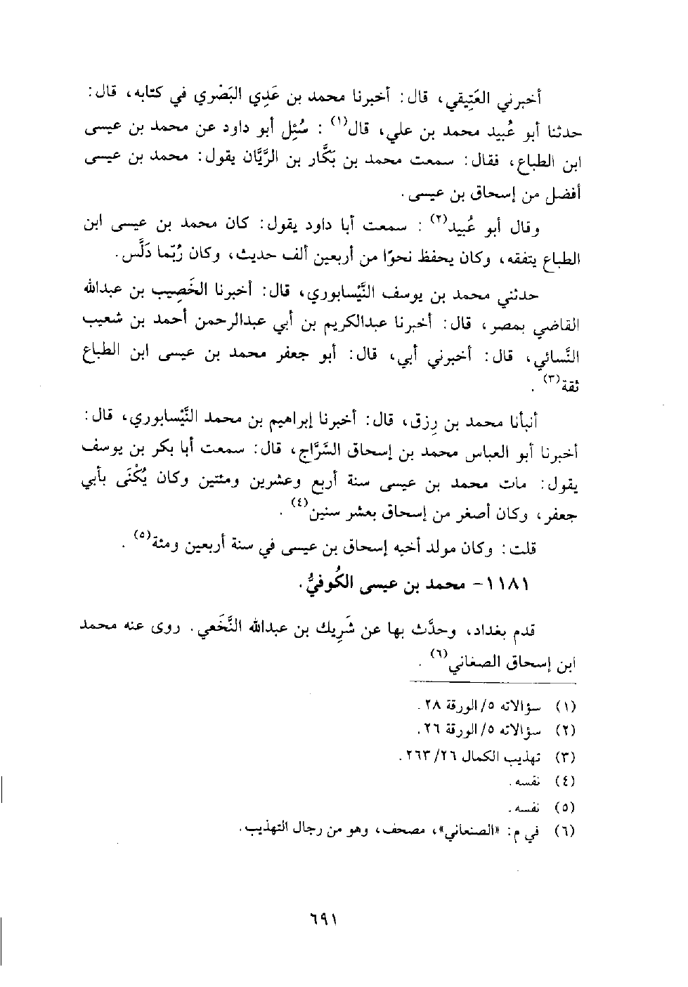 1181 - محمد بن عيسى الكوفي قدم بغداد، وحدث بها عن: شريك بن عبد الله النخعي، روى عنه: محمد بن إسحاق الصغاني.
