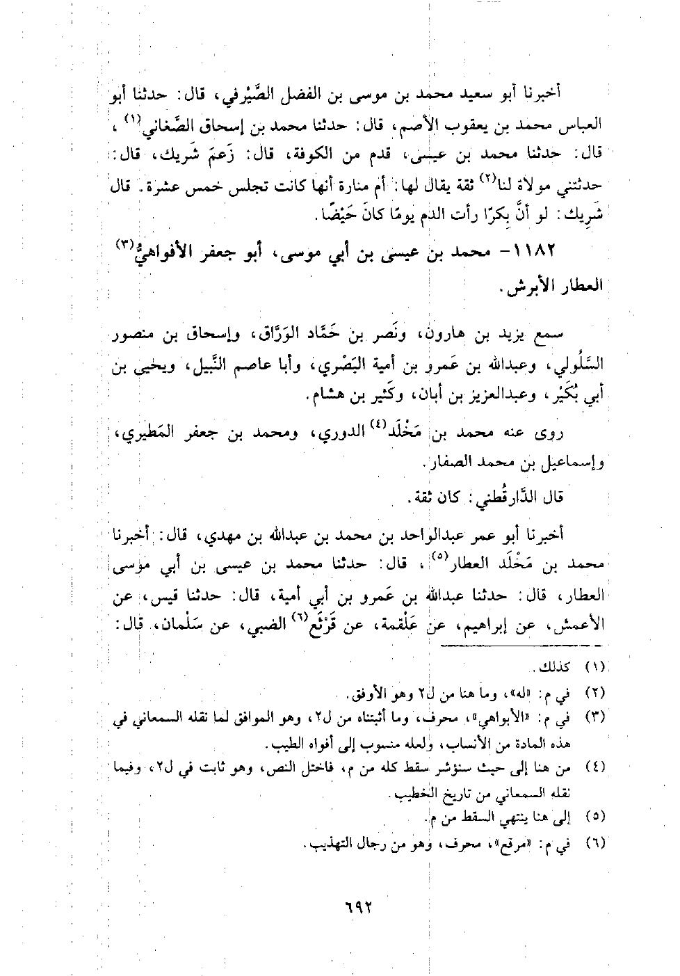 1182 - محمد بن عيسى بن أبي موسى أبو جعفر الأفواهي العطار الأبرش سمع: يزيد بن هارون، ونصر بن حماد الوراق، وإسحاق بن منصور السلولي، وعبد الله بن عمرو بن أمية البصري، وأبا عاصم النبيل، ويحيى بن أبي بكير، وعبد العزيز بن أبان، وكثير بن هشام.