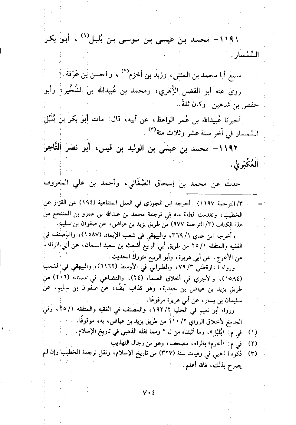 1191 - محمد بن عيسى بن موسى بن بلبل أبو بكر السمسار سمع: أبا موسى محمد بن المثنى، وزيد بن أخزم، والحسن بن عرفة.