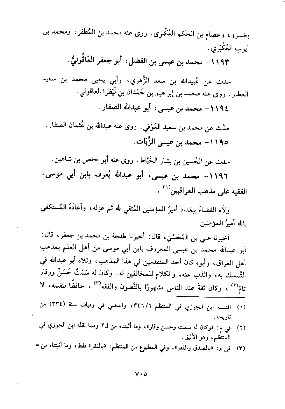 1193 - محمد بن عيسى بن الفضل أبو جعفر العاقولي حدث عن: عبيد الله بن سعد الزهري، وأبي يحيى محمد بن سعيد العطار، روى عنه: محمد بن إبراهيم بن حمدان بن نيظرا العاقولي.
