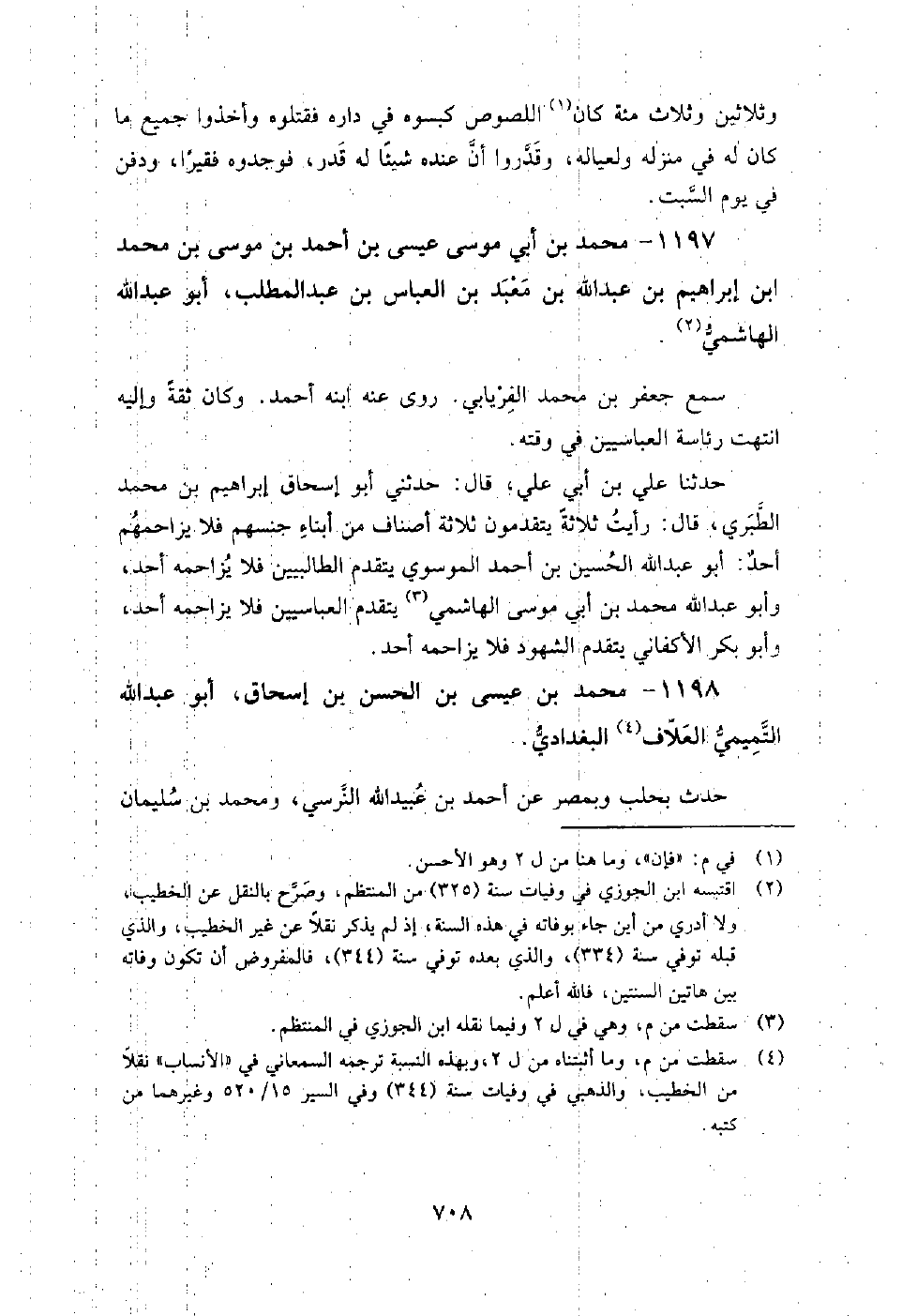 1197 - محمد بن أبي موسى عيسى بن أحمد بن موسى بن محمد بن إبراهيم بن عبد الله بن معبد بن العباس بن عبد المطلب أبو عبد الله الهاشمي سمع: جعفر بن محمد الفريابي، روى عنه: ابنه أحمد.