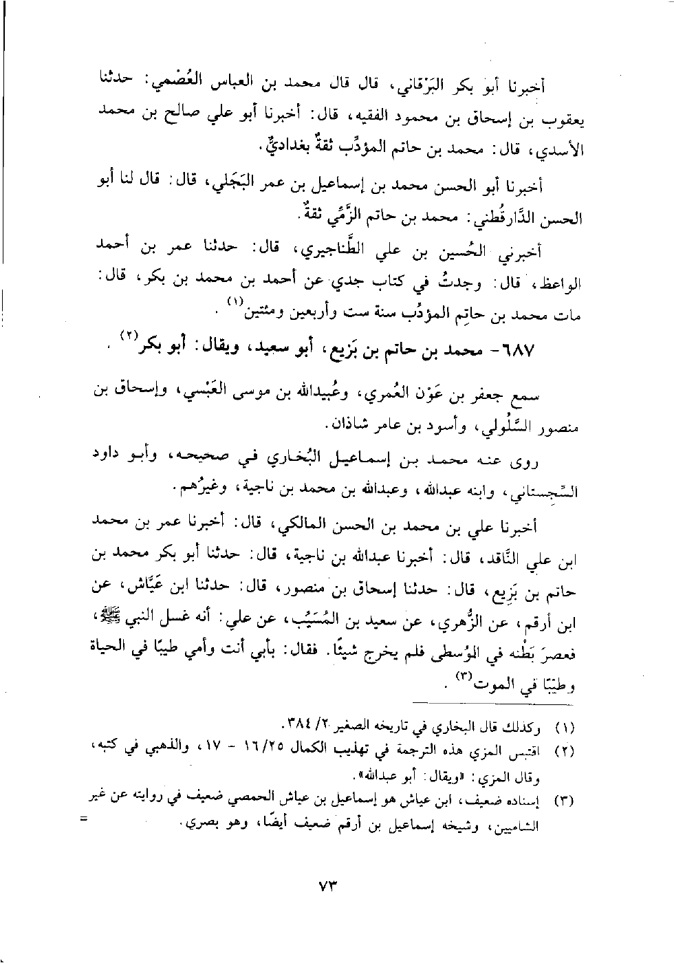 (504) -[3: 73] أَخْبَرَنَا عَلِيُّ بْنُ مُحَمَّدِ بْنِ الْحَسَنِ الْمَالِكِيُّ، قَالَ: أَخْبَرَنَا عُمَرُ بْنُ مُحَمَّدِ بْنِ عَلِيٍّ النَّاقِدُ، قَالَ: أَخْبَرَنَا عَبْدُ اللَّهِ بْنُ نَاجِيَةَ، قَالَ: حَدَّثَنَا أَبُو بَكْرٍ مُحَمَّدُ بْنُ حَاتِمِ بْنِ بَزِيعٍ، قَالَ: حَدَّثَنَا إِسْحَاقُ بْنُ مَنْصُورٍ، قَالَ: حَدَّثَنَا ابْنُ عَيَّاشٍ، عَنِ ابْنِ أَرْقَمَ، عَنِ الزُّهْرِيِّ، عَنْ سَعِيدِ بْنِ الْمُسَيِّبِ، عَنْ عَلِيٍّ، أَنَّهُ " غَسَّلَ النَّبِيَّ، صَلَّى اللَّهُ عَلَيْهِ وَسَلَّمَ فَعَصَر بَطْنَهُ فِي الْوُسْطَى فَلَمْ يُخْرِجْ شَيْئًا، فَقَالَ: بِأَبِي أَنْتَ وَأُمِّي طَيِّبًا فِي الْحَيَاةِ وَطَيِّبًا فِي الْمَوْتِ " أَخْبَرَنَا أبو بكر البرقاني، قَالَ: أَخْبَرَنَا علي بن عمر الحافظ، قَالَ: أَخْبَرَنَا الحسن بن رشيق، قَالَ: حَدَّثَنَا عبد الكريم بن عبد الرحمن النسائي، عن أبيه، ثم حَدَّثَنِي محمد بن علي الصوري، قَالَ: أَخْبَرَنَا الخصيب بن عبد الله القاضي، قَالَ: ناولني عبد الكريم بن أبي عبد الرحمن وكتب لي بخطه، قَالَ: سمعت أبي، يقول: محمد بن حاتم بغدادي ثقة، وكنيته أبو سعيد قرأت على البرقاني، عن المزكي، قَالَ: أَخْبَرَنَا محمد بن إسحاق الثقفي، قَالَ: مات محمد بن حاتم بن بزيع، يكنى أبا سعيد ببغداد في شهر رمضان سنة تسع وأربعين ومائتين