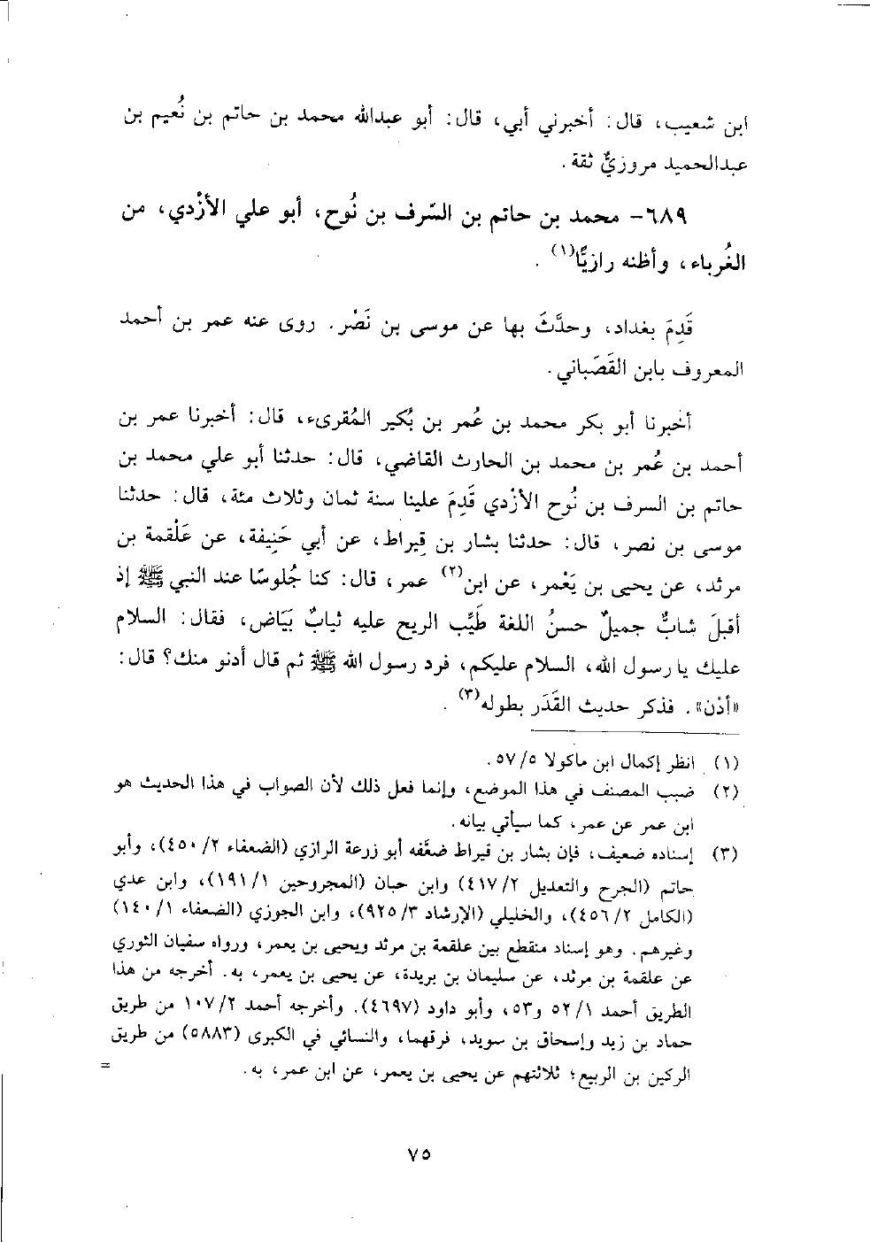 689 - محمد بن حاتم بن السرف بن نوح أبو علي الأزدي من الغرباء وأظنه رازيا قدم بغداد، وحدث بها عن: موسى بن نصر.