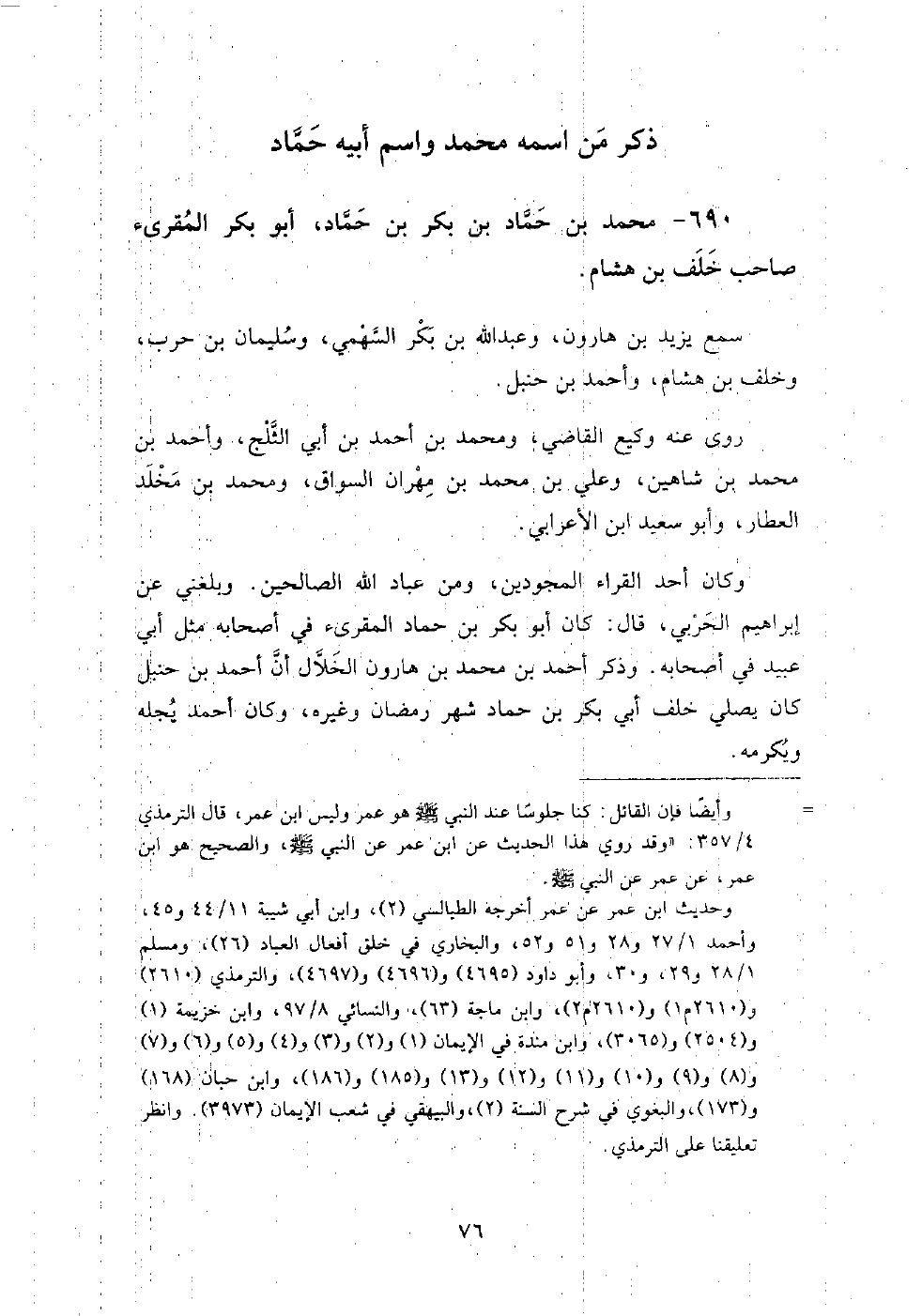 690 - محمد بن حماد بن بكر بن حماد أبو بكر المقرئ صاحب خلف بن هشام سمع: يزيد بن هارون، وعبد الله بن بكر السهمي، وسليمان بن حرب، وخلف بن هشام، وأحمد بن حنبل.