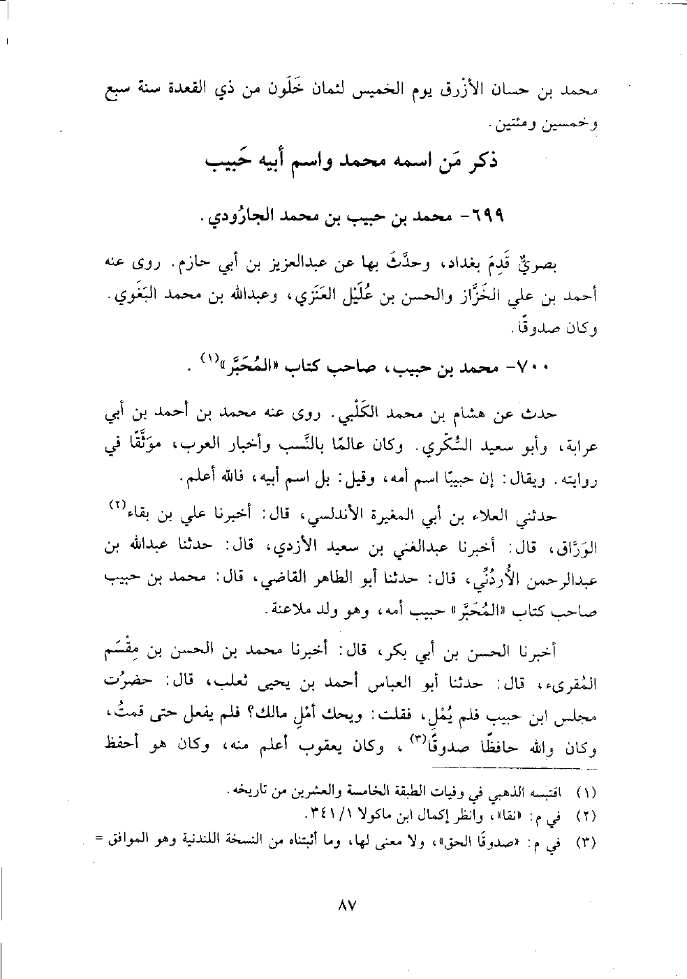 700 - محمد بن حبيب صاحب كتاب المحبر حدث عن: هشام بن محمد الكلبي.