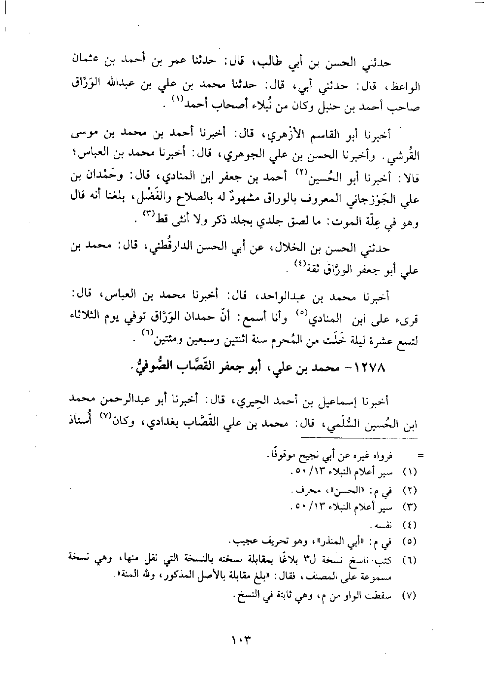 1278 - محمد بن علي أبو جعفر القصاب الصوفي أَخْبَرَنَا إسماعيل بن أحمد الحيري، قَالَ: أَخْبَرَنَا أبو عبد الرحمن محمد بن الحسين السلمي، قَالَ: محمد بن علي القصاب بغدادي، وكان أستاذ الجنيد، سمعت جعفر بن أحمد، يقول: إن الجنيد، كان يقول: الناس ينسبوني إلى سرى وكان أستاذي محمد القصاب حَدَّثَنَا عبد العزيز بن أبي الحسن القرميسيني، قَالَ: حَدَّثَنَا علي بن عبد الله الهمذاني، بمكة، قَالَ: سمعت محمد بن سعيد، يقول: سمعت جنيدا، يقول: قَالَ أستاذنا أبو جعفر القصاب، وسئل: ما بال أصحابك محرومين من الناس، قَالَ: لثلاث خصال: إحداها إن الله لا يرضى لهم ما في أيديهم، ولو رضي لهم ما لهم لترك ما لأنفسهم عليهم، والثانية أن الله تعالى لا يرضى أن يجعل حسناتهم في صحائفهم ولو رضي لهم لخلطهم بهم، الثالثة أنهم قوم لم يشيروا إلا إلى الله تعالى، فمنعهم كل شيء سواه وأفردهم به أَخْبَرَنَا السمسار، قَالَ: أَخْبَرَنَا الصفار، قَالَ: حَدَّثَنَا ابن قانع أن أبا جعفر القصاب مات في سنة خمس وسبعين ومائتين