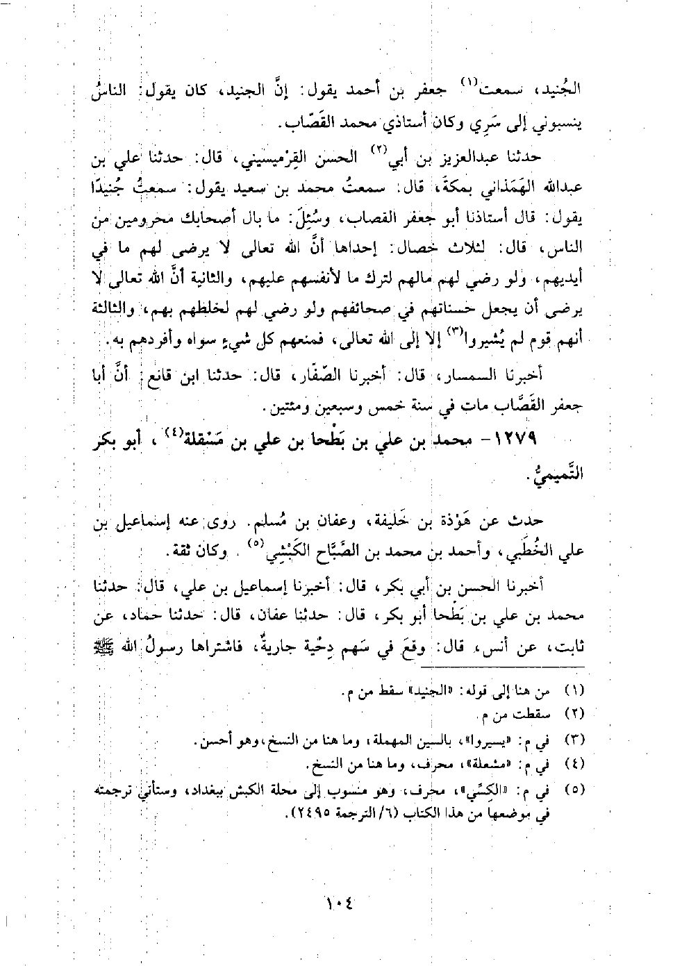 (865) -[4: 104] أَخْبَرَنَا الْحَسَنُ بْنُ أَبِي بَكْرٍ، قَالَ: أَخْبَرَنَا إِسْمَاعِيلُ بْنُ عَلِيٍّ، قَالَ: حَدَّثَنَا مُحَمَّدُ بْنُ عَلِيِّ بْنِ بَطْحَا أَبُو بَكْرٍ، قَالَ: حَدَّثَنَا عَفَّانُ، قَالَ: حَدَّثَنَا حَمَّادٌ، عَنْ ثَابِتٍ، عَنْ أَنَسٍ، قَالَ: وَقَعَ فِي سَهْمِ دِحْيَةَ جَارِيَةٌ، فَاشْتَرَاهَا رَسُولُ اللَّهِ صَلَّى اللَّهُ عَلَيْهِ وَسَلَّمَ بِسَبْعَةِ أَرْؤُسٍ أَخْبَرَنَا محمد بن أحمد بن رزق، قَالَ: أَخْبَرَنَا إسماعيل بن علي الخطبي، قَالَ: ومات محمد بن علي بن بطحا في ذي القعدة سنة ست وثمانين ومائتين