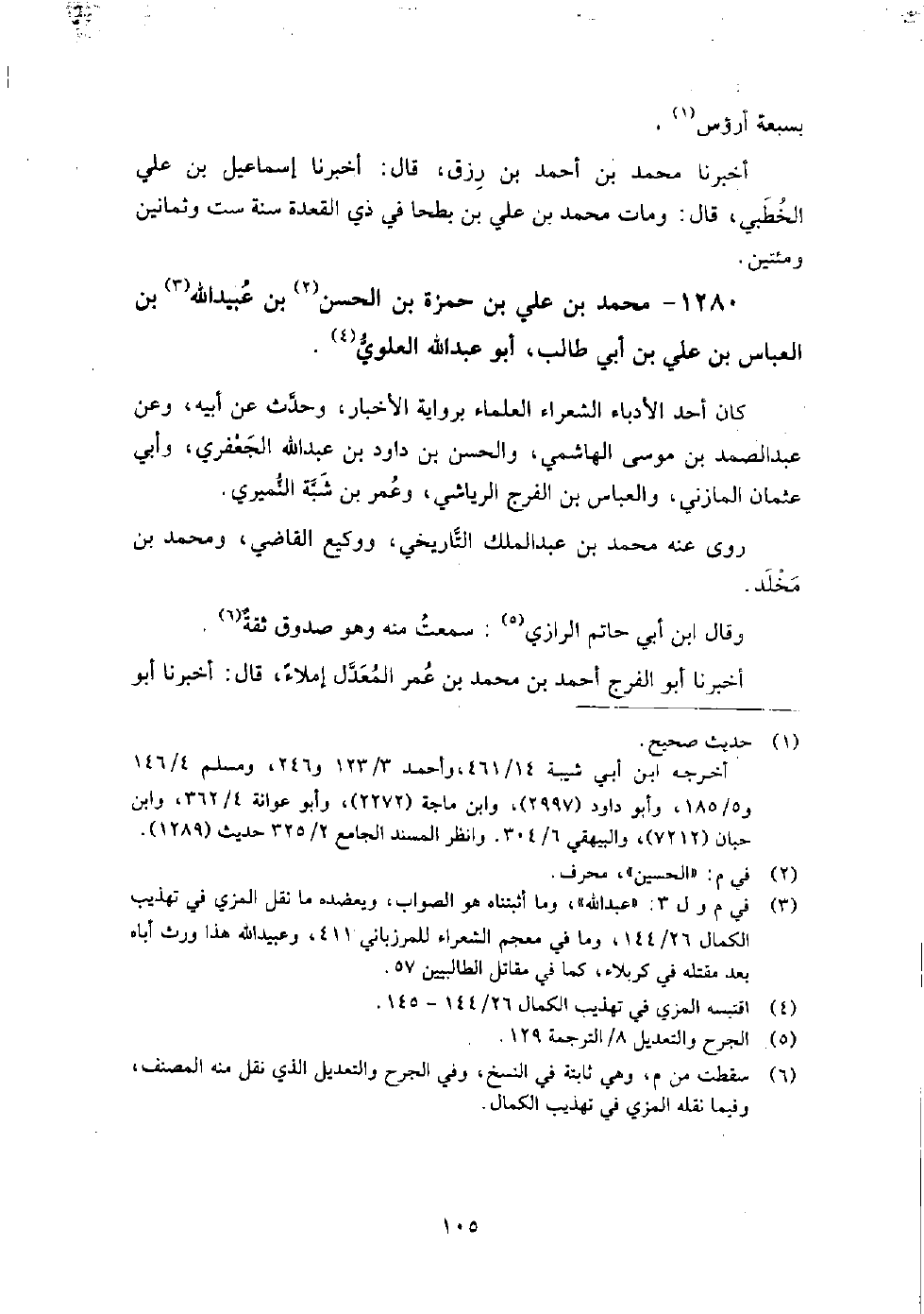 1280 - محمد بن علي بن حمزة بن الحسن بن عبيد الله بن العباس بن علي بن أبي طالب، أبو عبد الله العلوي كان أحد الأدباء الشعراء العلماء برواية الأخبار، وحدث عن أبيه، وعن عبد الصمد بن موسى الهاشمي، والحسن بن داود بن عبد الله الجعفري، وأبي عثمان المازني، والعباس بن الفرج الرياشي، وعمر بن شبة النميري.
