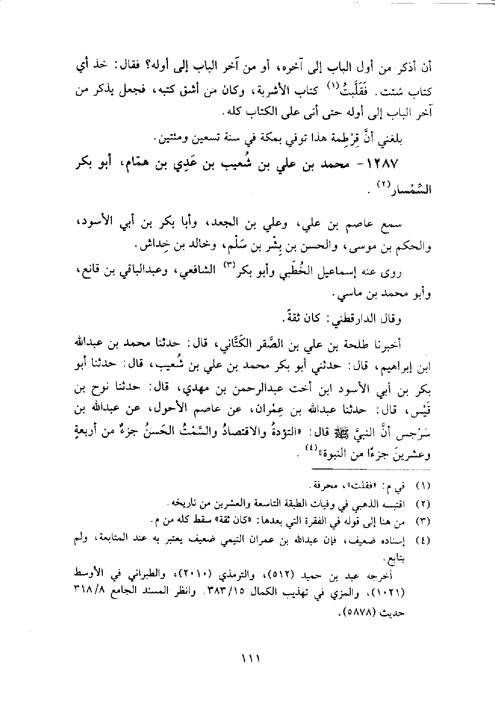 (871) -[4: 111] أَخْبَرَنَا طَلْحَةُ بْنُ عَلِيِّ بْنِ الصَّقْرِ الْكِتَّانِيُّ، قَالَ: حَدَّثَنَا مُحَمَّدُ بْنُ عَبْدِ اللَّهِ بْنِ إِبْرَاهِيمَ، قَالَ: حَدَّثَنِي أَبُو بَكْرٍ مُحَمَّدُ بْنُ عَلِيِّ بْنِ شُعَيْبٍ، قَالَ: حَدَّثَنَا أَبُو بَكْرِ بْنُ أَبِي الأَسْوَدَ ابْنُ أُخْتِ عَبْدِ الرَّحْمَنِ بْنِ مَهْدِيٍّ، قَالَ: حَدَّثَنَا نُوحُ بْنُ قَيْسٍ، قَالَ: حَدَّثَنَا عَبْدُ اللَّهِ بْنُ عِمْرَانَ، عَنْ عَاصِمٍ الأَحْوَلِ، عَنْ عَبْدِ اللَّهِ بْنِ سَرْجِسَ أَنَّ النَّبِيَّ صَلَّى اللَّهُ عَلَيْهِ وَسَلَّمَ قَالَ: " التُّؤَدَةُ وَالاقْتِصَادُ وَالسَّمْتُ الْحَسَنُ جُزْءٌ مِنْ أَرْبَعَةٍ وَعِشْرِينَ جُزْءًا مِنَ النُّبُوَّةِ " أَخْبَرَنَا السمسار، قَالَ: أَخْبَرَنَا الصفار، قَالَ: حَدَّثَنَا ابن قانع، أن محمد بن علي بن شعيب السمسار مات في سنة تسعين ومائتين