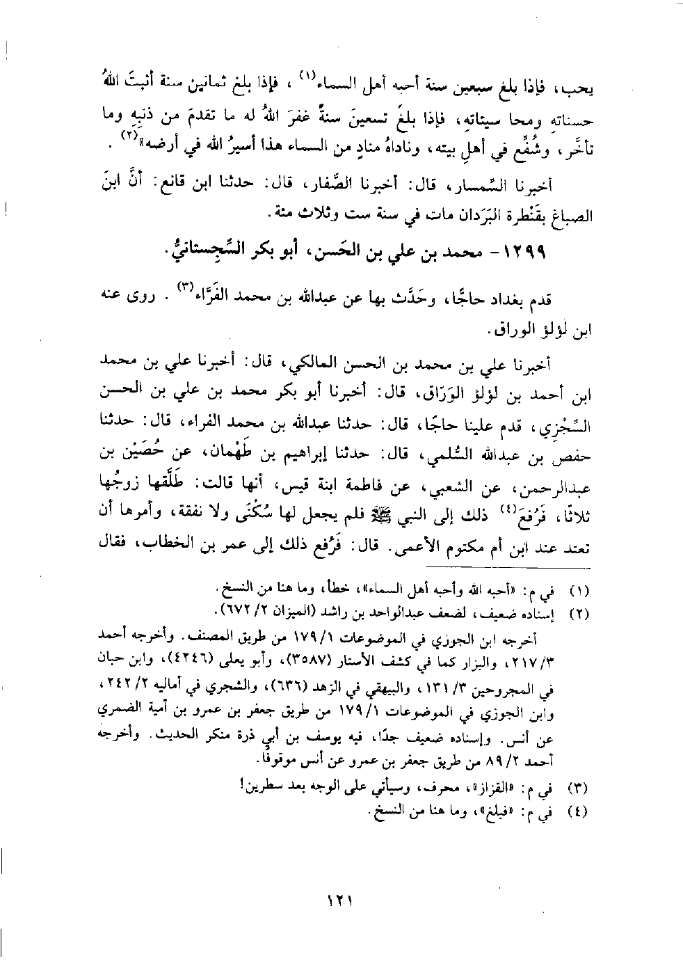1299 - محمد بن علي بن الحسن أبو بكر السجستاني قدم بغداد حاجا، وحدث بها عن عبد الله بن محمد الفراء.