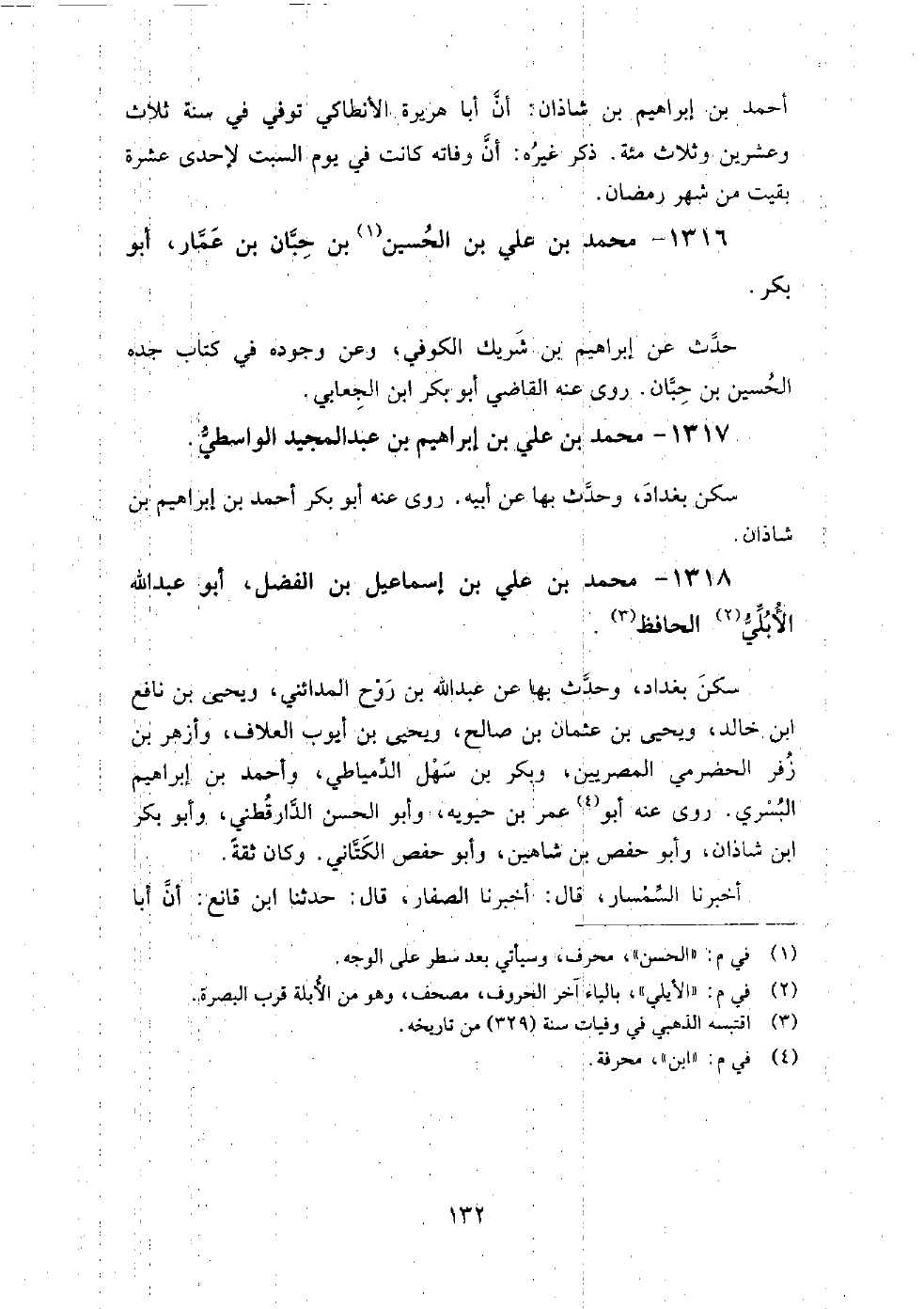 1316 - محمد بن علي بن الحسين بن حبان بن عمار أبو بكر حدث عن إبراهيم بن شريك الكوفي، وعن وجوده في كتاب جده الحسين بن حبان.
