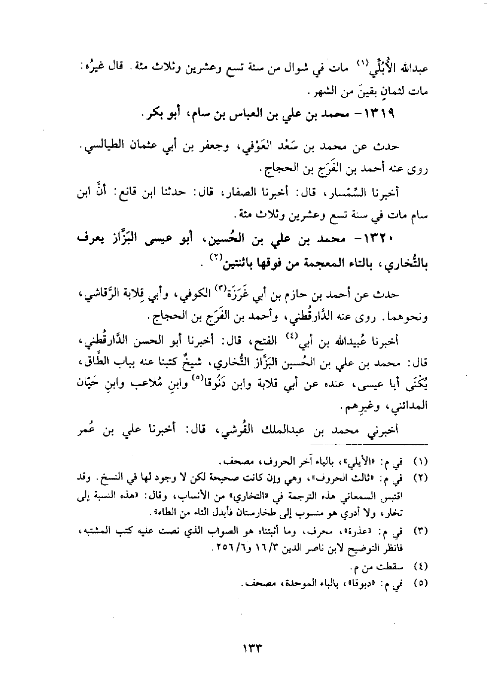 1320 - محمد بن علي بن الحسين أبو عيسى البزاز يعرف بالتخاري بالتاء المعجمة من فوقها باثنتين حدث عن أحمد بن حازم بن أبي غرزة الكوفي، وأبي قلابة الرقاشي، ونحوهما.