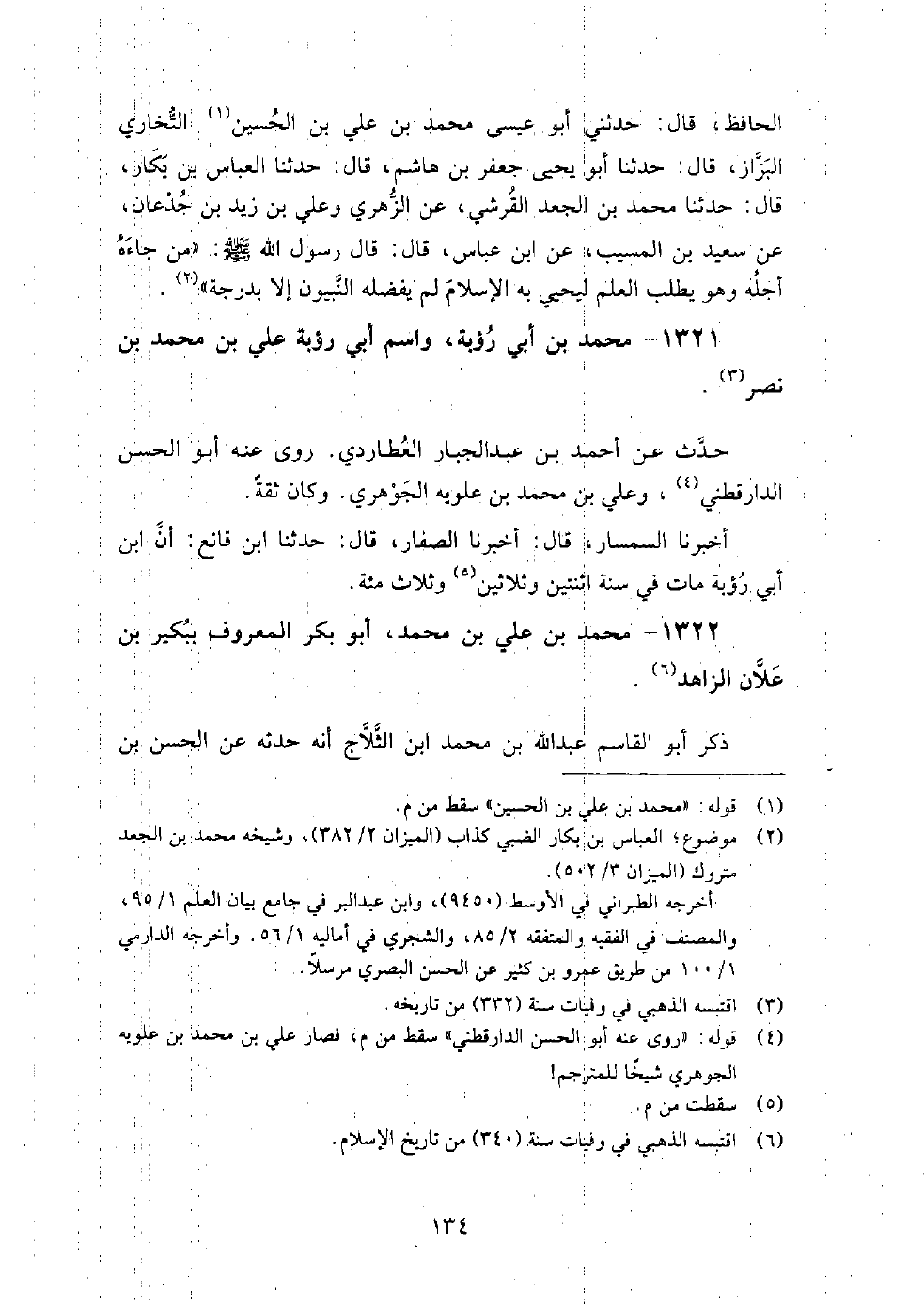 1322 - محمد بن علي بن محمد أبو بكر المعروف ببكير بن علان الزاهد ذكر أبو القاسم عبد الله بن محمد ابن الثلاج، أنه حدثه عن الحسن بن سلام السواق.