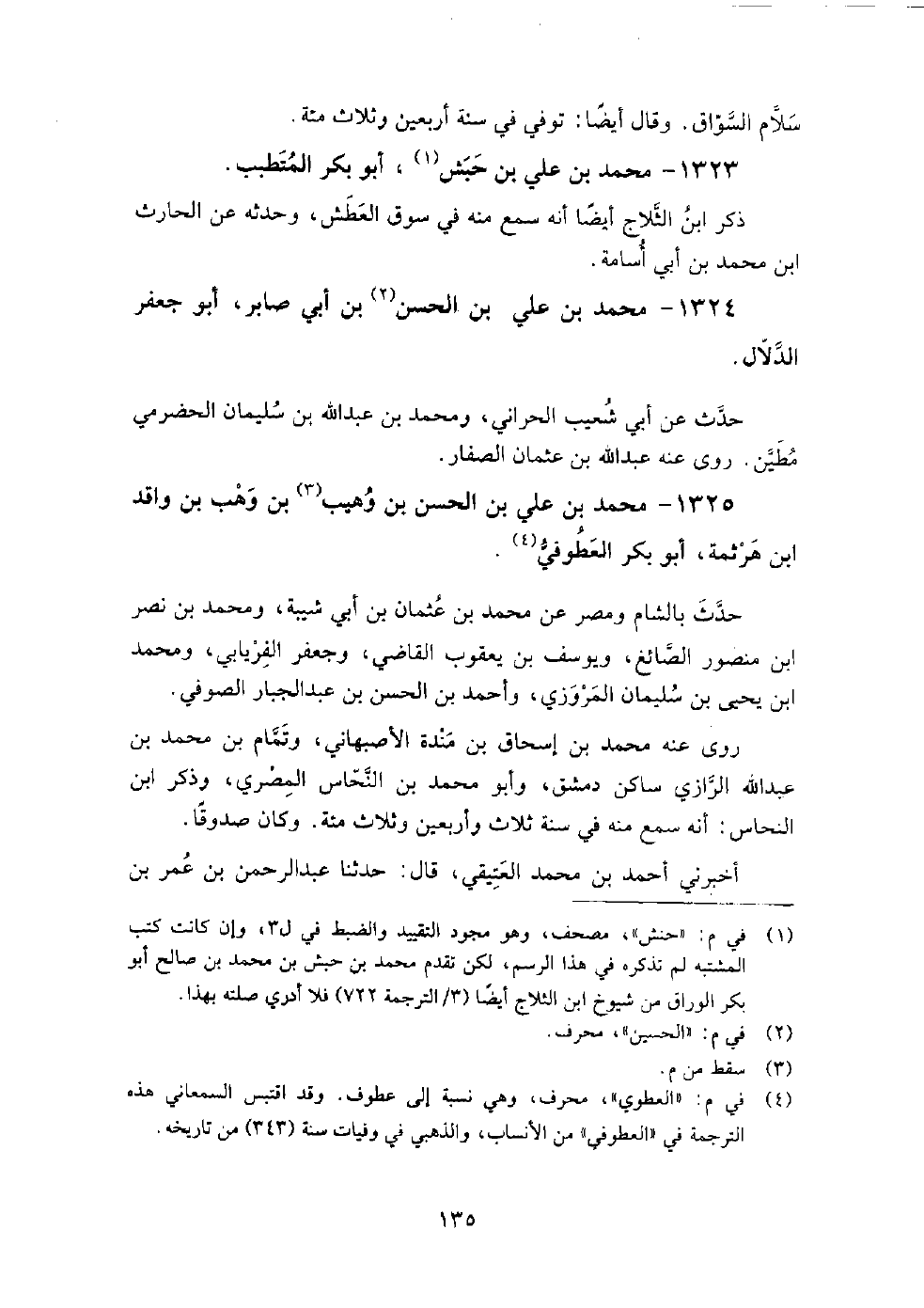 1323 - محمد بن علي بن حبش أبو بكر المتطبب ذكر ابن الثلاج أيضا أنه سمع منه في سوق العطش وحدثه عن الحارث بن محمد بن أبي أسامة.