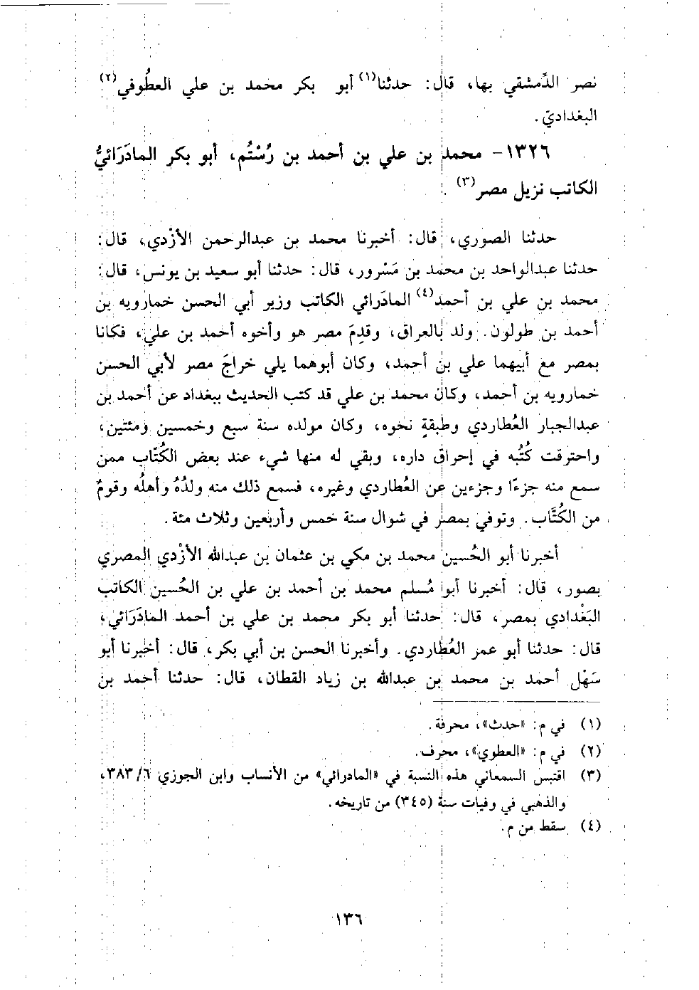 (888) -[4: 136] أَخْبَرَنَا أَبُو الْحُسَيْنِ مُحَمَّدُ بْنُ مَكِّيِّ بْنِ عُثْمَانَ بْنِ عَبْدِ اللَّهِ الأَزْدِيُّ الْمِصْرِيُّ بِصُورَ، قَالَ: أَخْبَرَنَا أَبُو مُسْلِمٍ مُحَمَّدُ بْنُ أَحْمَدَ بْنِ عَلِيِّ بْنِ الْحُسَيْنِ الْكَاتِبُ الْبَغْدَادِيُّ بِمِصْرَ، قَالَ: حَدَّثَنَا أَبُو بَكْرٍ مُحَمَّدُ بْنُ عَلِيِّ بْنِ أَحْمَدَ الْمَادَرَائِيُّ، قَالَ: حَدَّثَنَا أَبُو عُمَرَ الْعُطَارِدِيُّ.