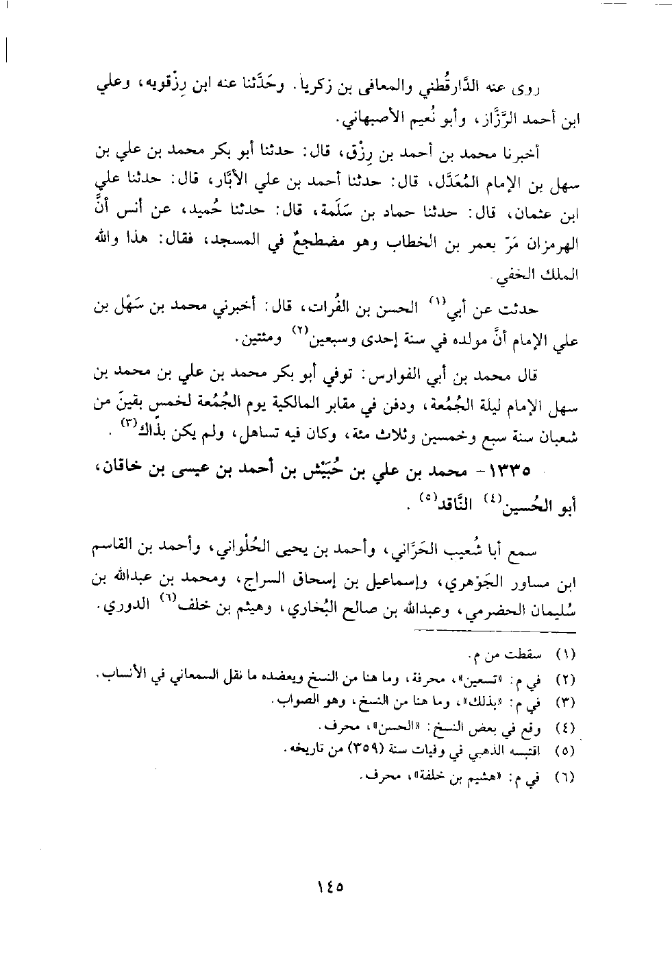 1335 - محمد بن علي بن حبيش بن أحمد بن عيسى بن خاقان أبو الحسين الناقد سمع أبا شعيب الحراني، وأحمد بن يحيى الحلواني، وأحمد بن القاسم بن مساور الجوهري، وإسماعيل بن إسحاق السراج، ومحمد بن عبد الله بن سليمان الحضرمي، وعبد الله بن صالح البخاري، وهيثم بن خلفة الدوري، حَدَّثَنَا عنه ابن رزقويه وعبد الله بن يحيى السكري، والقاضي أبو الفرج بن سميكة، وأبو نعيم الأصبهاني، وأبو علي بن شاذان.
