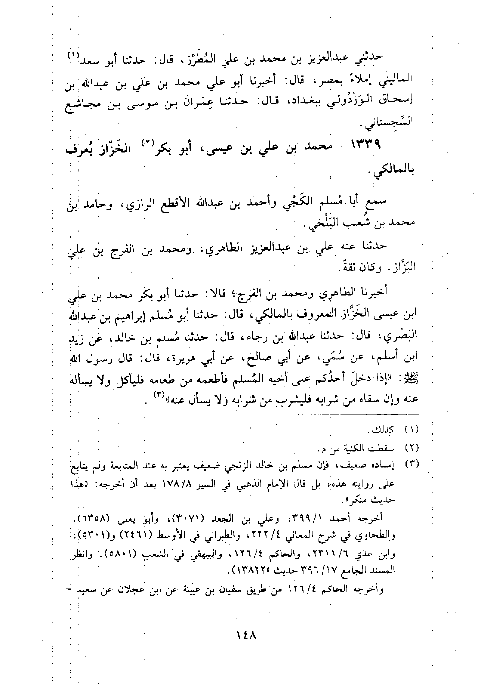 (894) -[4: 148] أَخْبَرَنَا الطَّاهِرِيُّ وَمُحَمَّدُ بْنُ الْفَرَجِ، قَالا: حَدَّثَنَا أَبُو بَكْرٍ مُحَمَّدُ بْنُ عَلِيِّ بْنِ عِيسَى الْخَرَّازُ الْمَعْرُوفُ بِالْمَالِكِيِّ، قَالَ: حَدَّثَنَا أَبُو مُسْلِمٍ إِبْرَاهِيمُ بْنُ عَبْدِ اللَّهِ الْبَصْرِيُّ، قَالَ: حَدَّثَنَا عَبْدُ اللَّهِ بْنُ رَجَاءٍ، قَالَ: حَدَّثَنَا مُسْلِمُ بْنُ خَالِدٍ، عَنْ زَيْدِ بْنِ أَسْلَمَ، عَنْ سُمَيٍّ، عَنْ أَبِي صَالِحٍ، عَنْ أَبِي هُرَيْرَةَ، قَالَ: قَالَ رَسُولُ اللَّهِ صَلَّى اللَّهُ عَلَيْهِ وَسَلَّمَ: " إِذَا دَخَلَ أَحَدُكُمْ عَلَى أَخِيهِ الْمُسْلِمِ فَأَطْعَمَهُ مِنْ طَعَامِهِ فَلْيَأْكُلْ وَلا يَسْأَلْهُ عَنْهُ وَإِنْ سَقَاهُ مِنْ شَرَابِهِ فَلْيَشْرَبْ مِنْ شَرَابِهِ وَلا يَسْأَلْ عَنْهُ "