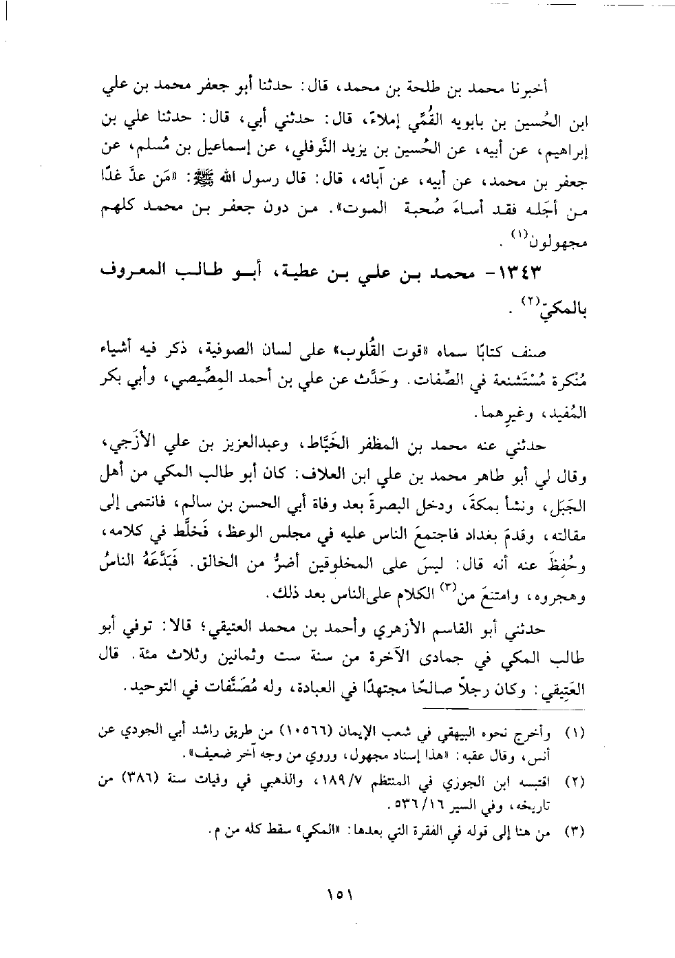 1343 - محمد بن علي بن عطية أبو طالب المعروف بالمكي صنف كتابا سماه قوت القلوب على لسان الصوفية، ذكر فيه أشياء منكرة مستشنعة في الصفات.