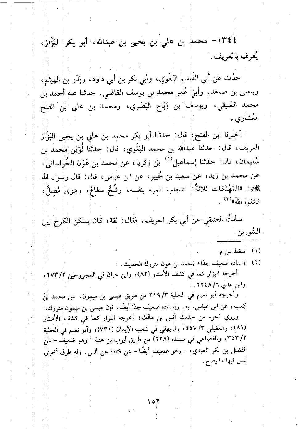 1344 - محمد بن علي بن يحيى بن عبد الله أبو بكر البزاز يعرف بالعريف حدث عن أبي القاسم البغوي، وأبي بكر بن أبي داود، وبدر بن الهيثم، ويحيى بن صاعد، وأبي عمر محمد بن يوسف القاضي.