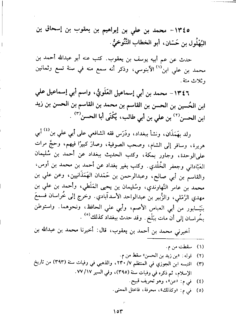 1346 - محمد بن أبي إسماعيل العلوي واسم أبي إسماعيل علي بن الحسين بن الحسن بن القاسم بن محمد بن القاسم بن الحسن بن زيد بن الحسن بن علي بن أبي طالب يكنى أبا الحسن ولد بهمذان، ونشأ ببغداد، ودرس فقه الشافعي على أبي علي بن أبي هريرة، وسافر إلى الشام، وصحب الصوفية، وصار كبيرا فيهم، وحج مرات على الوحدة، وجاور بمكة، وكتب الحديث ببغداد عن أحمد بن سليمان العبداني وجعفر الخلدي.