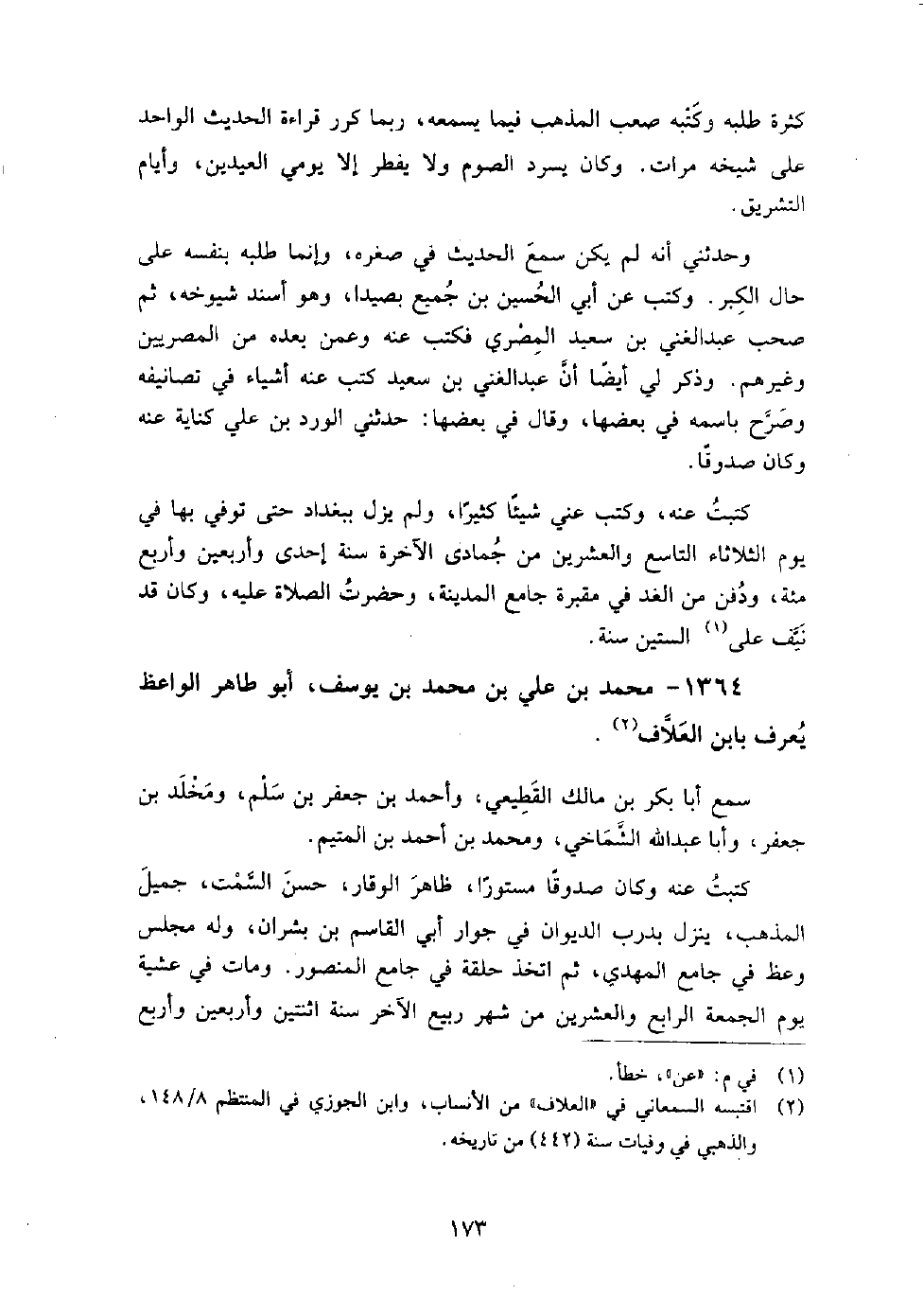 1364 - محمد بن علي بن محمد بن يوسف أبو طاهر الواعظ يعرف بابن العلاف سمع أبا بكر بن مالك القطيعي، وأحمد بن جعفر بن سلم، ومخلد بن جعفر، وأبا عبد الله الشماخي، ومحمد بن أحمد بن المتيم.