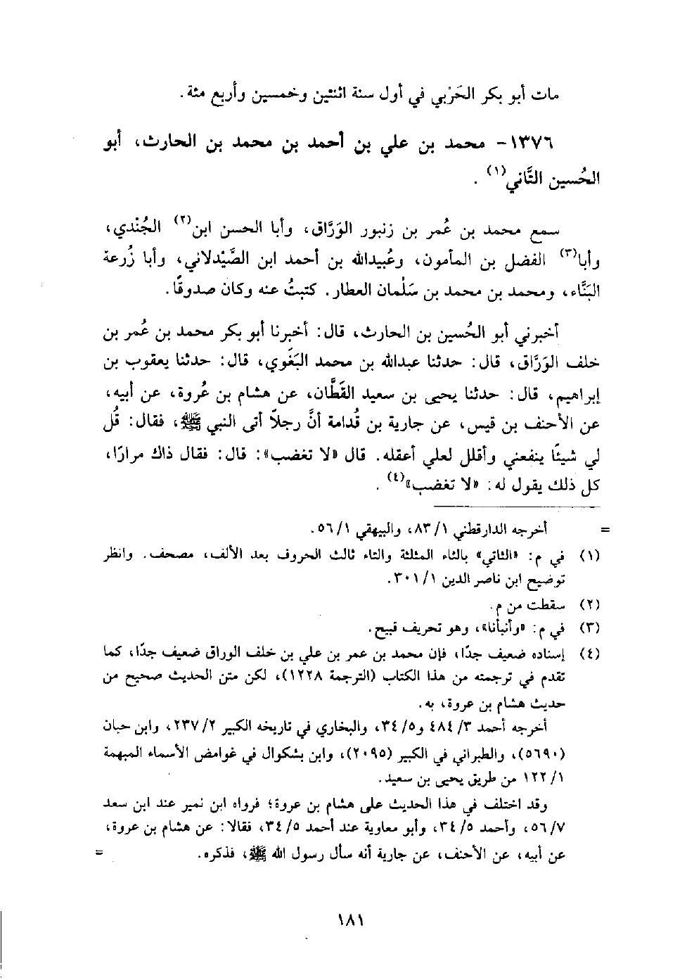 قَالَ: فَقَالَ ذَاكَ مِرَارًا، كُلُّ ذَلِكَ يَقُولُ لَهُ: " لا تَغْضَبْ " سمعت ابن الحارث، يقول: ولدت في سنة ثمان وثمانين وثلاث مائة.
