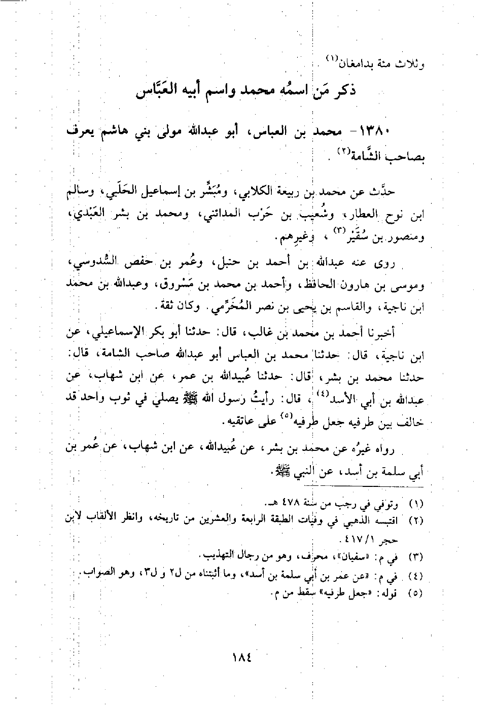 1380 - محمد بن العباس أبو عبد الله مولى بني هاشم يعرف بصاحب الشامة حدث عن محمد بن ربيعة الكلابي، ومبشر بن إسماعيل الحلبي، وسالم بن نوح العطار، وشعيب بن حرب المدائني، ومحمد بن بشر العبدي، ومنصور بن سقير، وغيرهم.