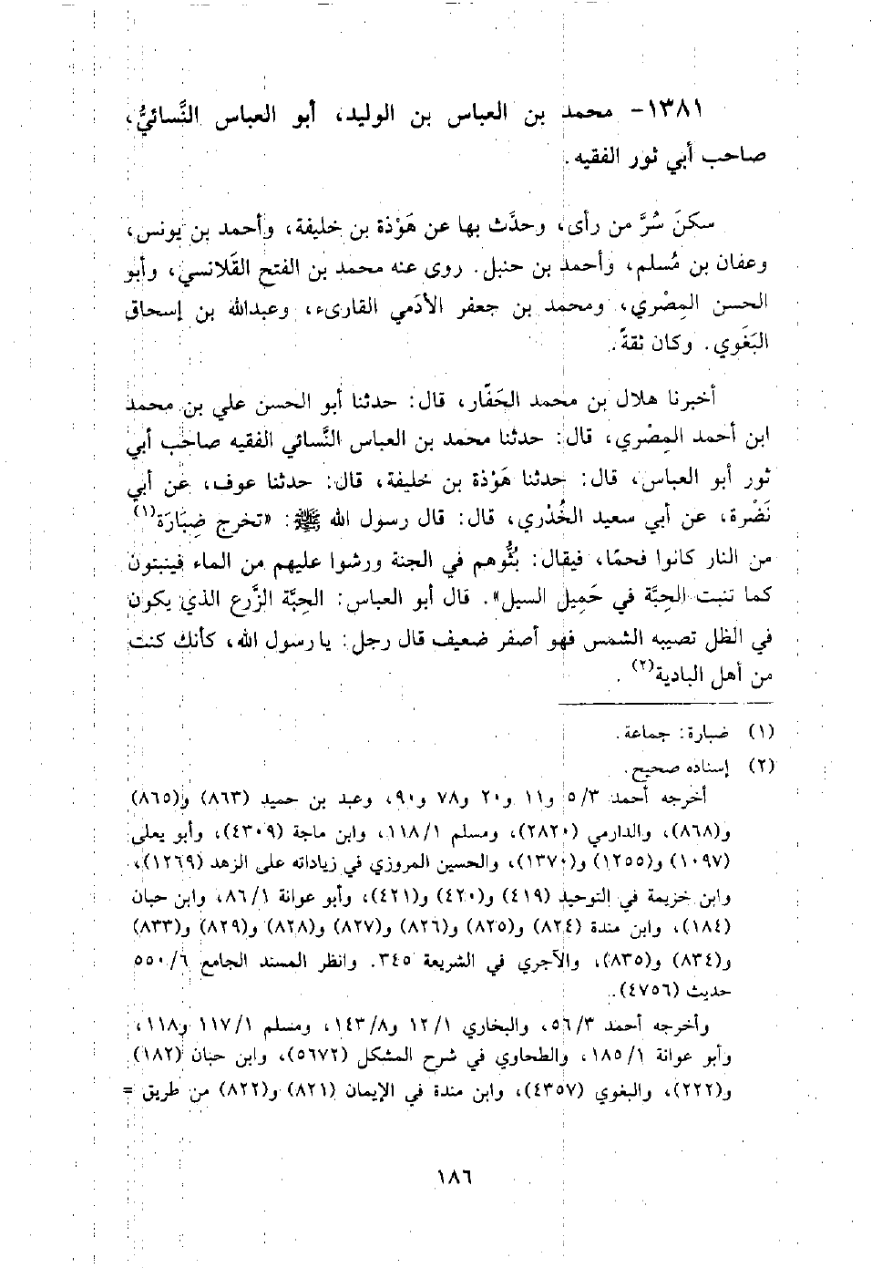 1381 - محمد بن العباس بن الوليد أبو العباس النسائي صاحب أبي ثور الفقيه سكن سر من رأى وحدث بها عن هوذة بن خليفة، وأحمد بن يونس، وعفان بن مسلم، وأحمد بن حنبل.