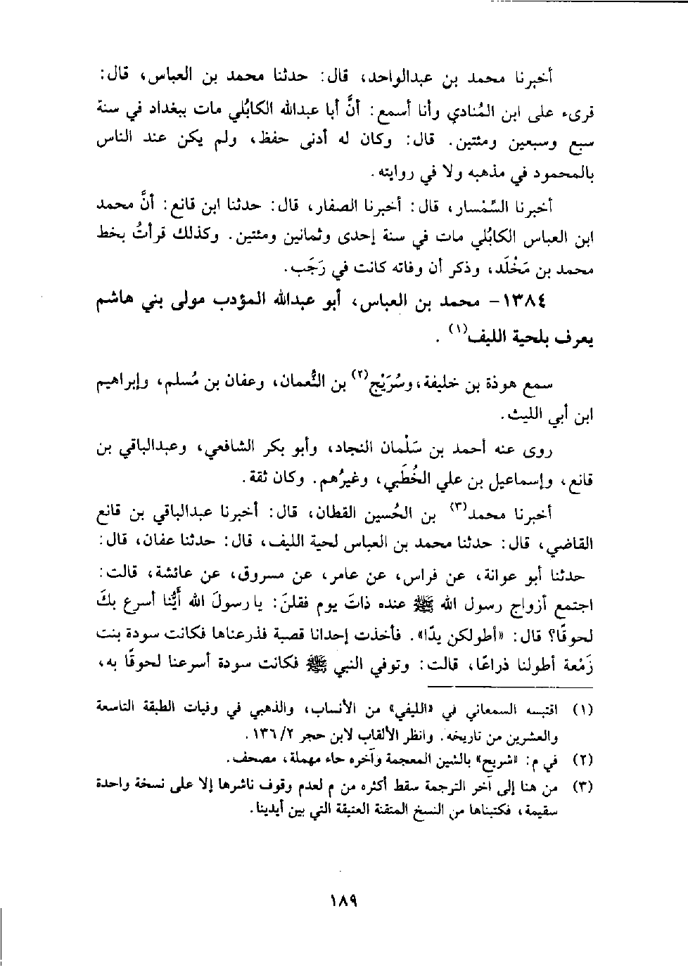 1384 - محمد بن العباس أبو عبد الله المؤدب مولى ابن هاشم يعرف بلحية الليف سمع هوذة بن خليفة، وسريج بن النعمان، وعفان بن مسلم، وإبراهيم بن أبي الليث.