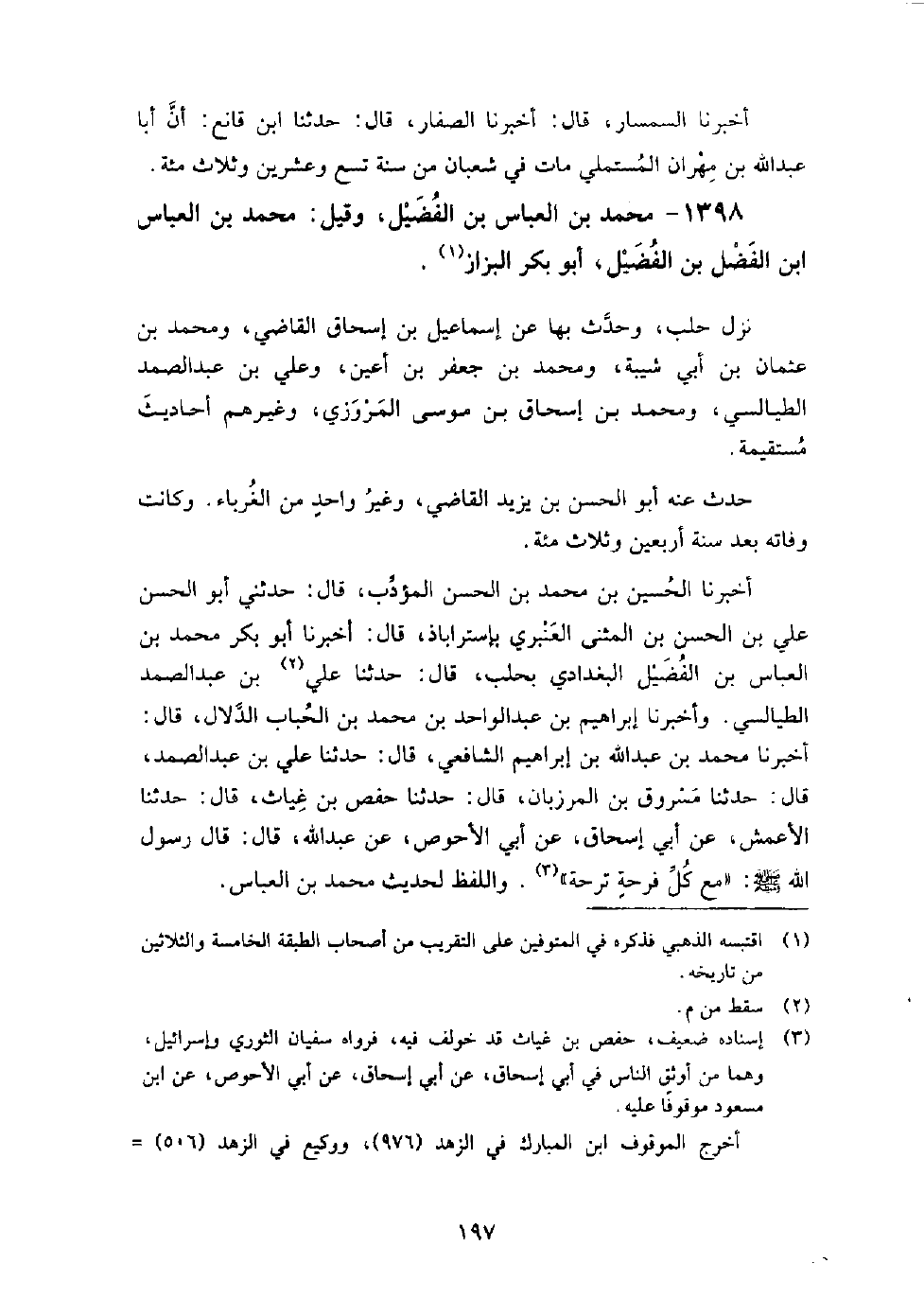 1398 - محمد بن العباس بن الفضيل وقيل محمد بن العباس بن الفضل بن الفضيل أبو بكر البزاز نزل حلب، وحدث بها عن إسماعيل بن إسحاق القاضي، ومحمد بن عثمان بن أبي شيبة، ومحمد بن جعفر بن أعين، وعلي بن عبد الصمد الطيالسي، ومحمد بن إسحاق بن موسى المروزي، وغيرهم أحاديث مستقيمة.