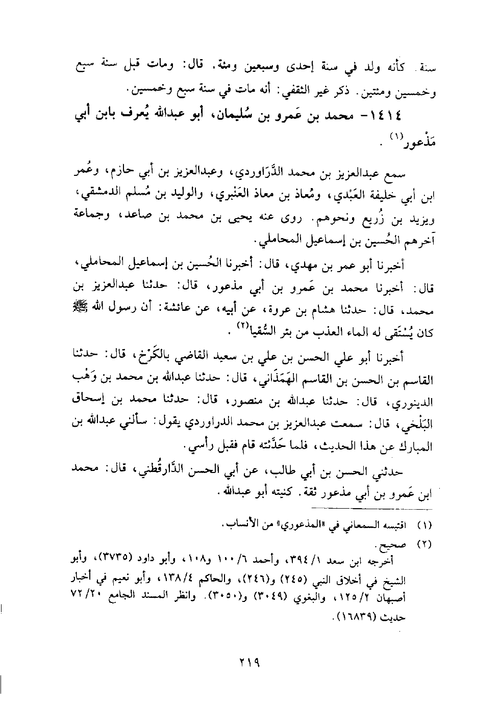 1414 - محمد بن عمرو بن سليمان أبو عبد الله يعرف بابن أبي مذعور سمع عبد العزيز بن محمد الدراوردي، وعبد العزيز بن أبي حازم، وعمر بن أبي خليفة العبدي، ومعاذ بن معاذ العنبري، والوليد بن مسلم الدمشقي، ويزيد بن زريع ونحوهم.